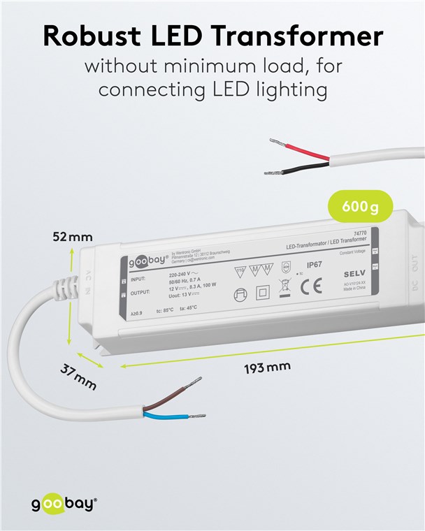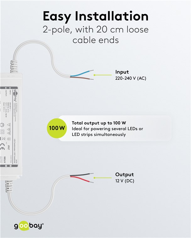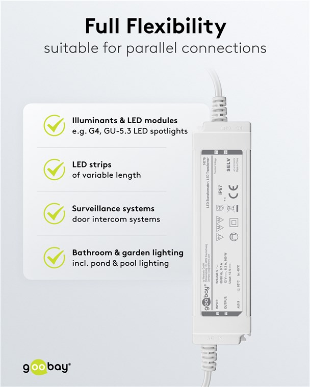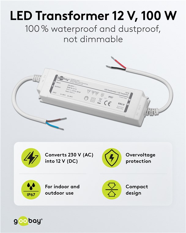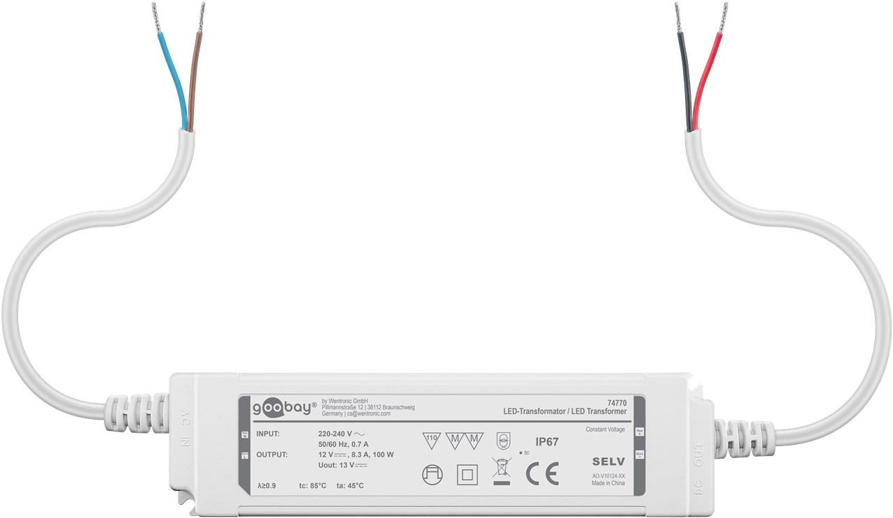 12Volt 100W Netzteil für für LED- und Beleuchtungsanwendungen IP67, für Innen- und Außenanwendungen z.B. im Feuchtebereich (z.B. Industrie- Gastro- oder Ausseneinsatz) nach IP67 mit konstante Ausgangsspannung von 12V Gleichspannung Ideal für Licht-Setups in Feuchträumen und im Outdoorbereich, z. B. Bad- und Gartenbeleuchtung sowie Teich- oder Poolbeleuchtung. Der Trafo versorgt LEDs mit konstanter Spannung (CV) und bietet so eine hohe Flexibilität, z. B. beim Anschluss unterschiedlicher Längen von LED-Streifen. Die perfekte Lösung für LED-Module mit fester Spannung und eigenem Vorwiderstand.