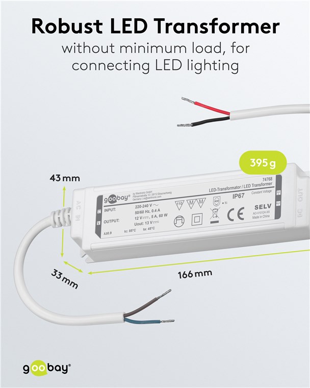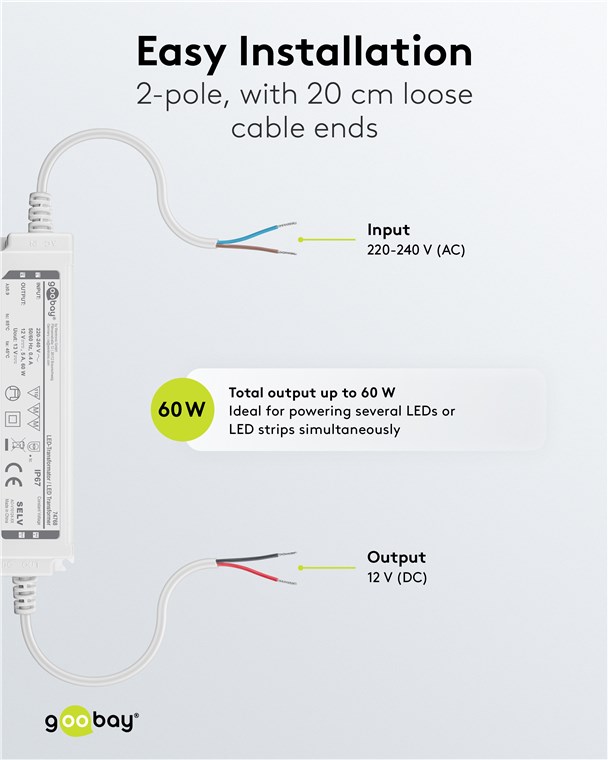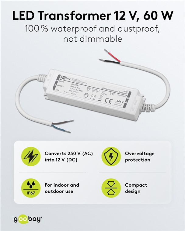 Netzteil für für LED- und Beleuchtungsanwendungen IP67, für Innen- und Außenanwendungen z.B. im Feuchtebereich (z.B. Industrie- Gastro- oder Ausseneinsatz) nach IP67 mit konstante Ausgangsspannung von 12V Gleichspannung Ideal für Licht-Setups in Feuchträumen und im Outdoorbereich, z. B. Bad- und Gartenbeleuchtung sowie Teich- oder Poolbeleuchtung. Der Trafo versorgt LEDs mit konstanter Spannung (CV) und bietet so eine hohe Flexibilität, z. B. beim Anschluss unterschiedlicher Längen von LED-Streifen. Die perfekte Lösung für LED-Module mit fester Spannung und eigenem Vorwiderstand.