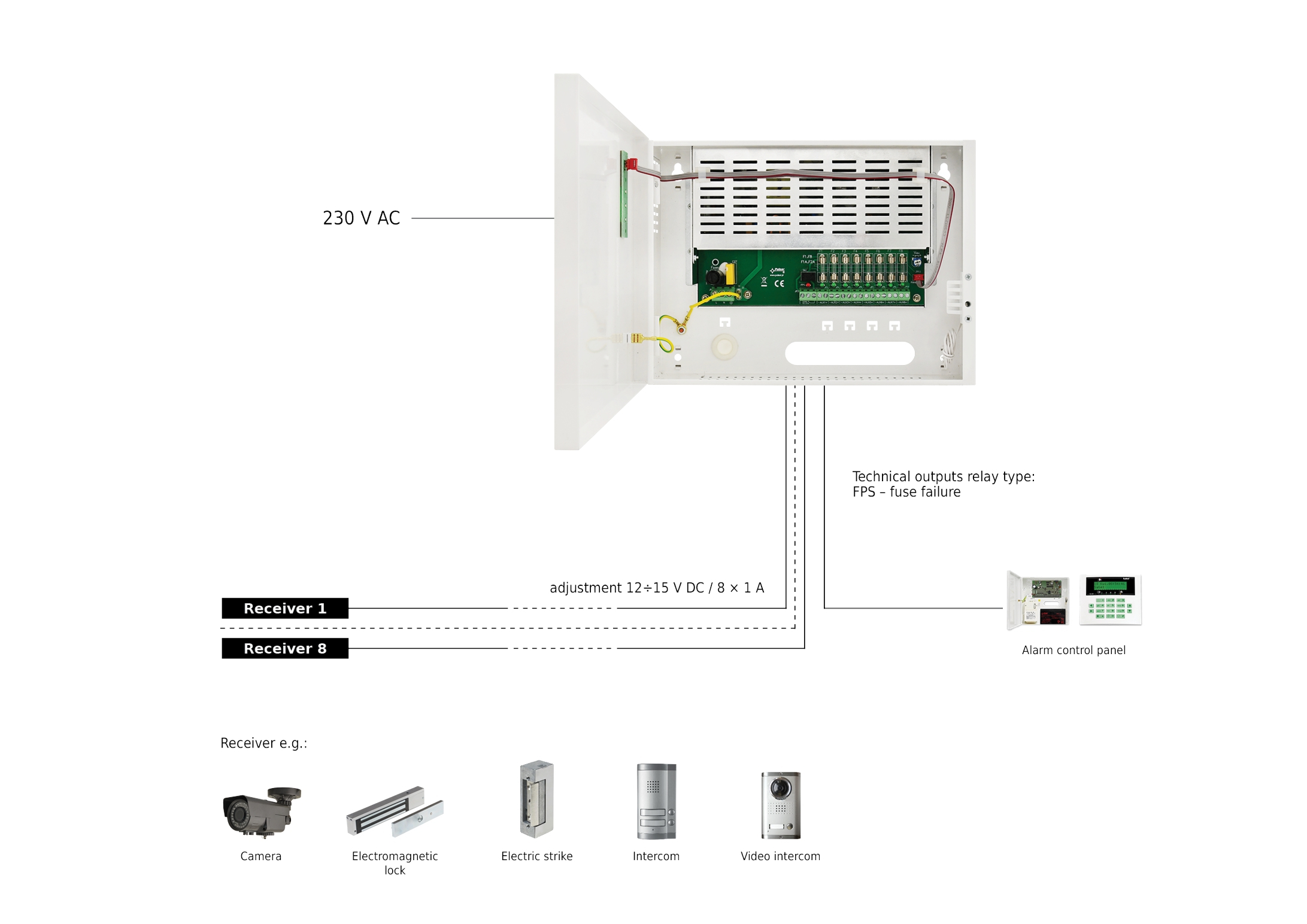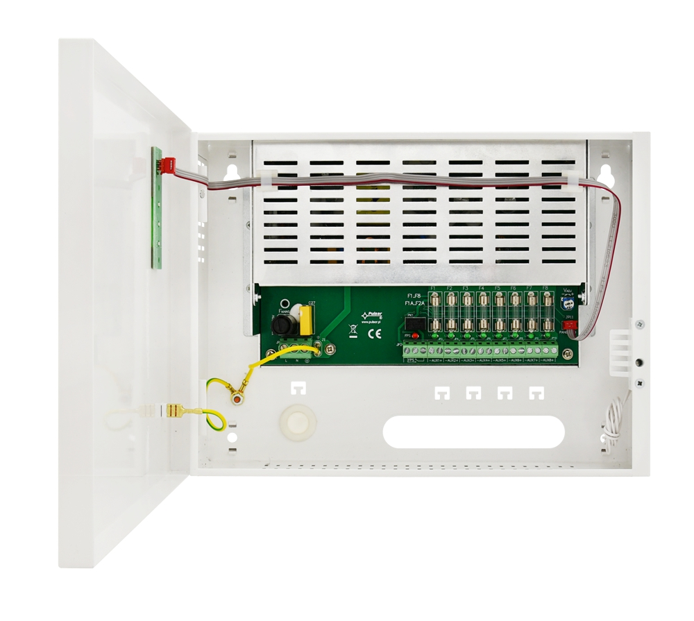 Aufgabe des stabilisierten Netzgeräts ist es, die Kameranlagen, Alarmtechnik, Steuerungstechnik aller Art zu speisen, die stabilisierte Stromspannung 12V DC erfordern. Die Ausgangsspannung kann durch ein Potentiometer zwischen 12V-15V DC nachgestellt werden um ggf. Kabellängen auszugleichen. Dieses Netzteil ist mit 8 unabhängig voneinander abgesicherten Ausgängen ausgestattet.