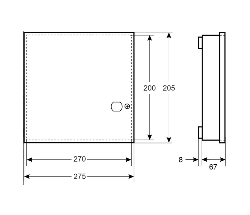Abmessungen: Breite: 275mm / Höhe: 205mm / Tiefe: 67+8mm