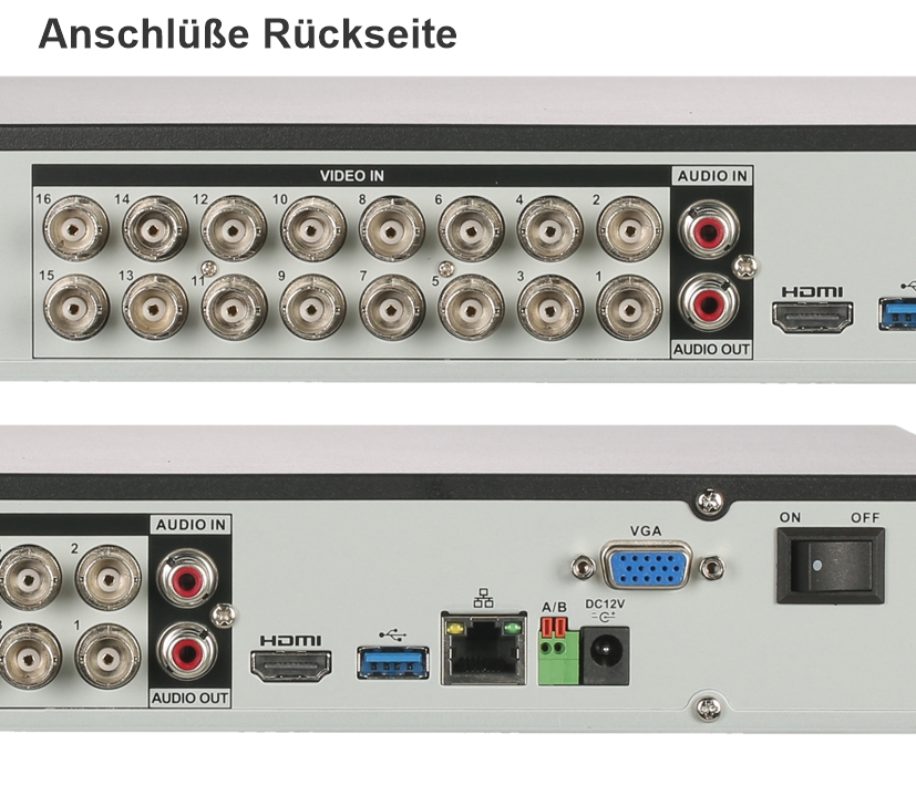 DVR Multiformat Hybrid Rekorder 5in1 Analog AHD TVI CVI und IP-LAN Kameras 16+16Kanal