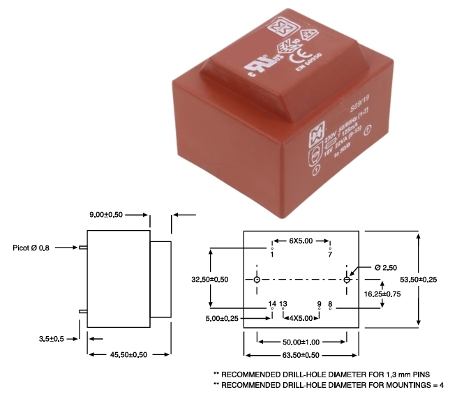 Zum direkten Einlöten in Leiterplatten. Galvanisch getrennte Wicklungen, gute Zwischenisolation, auch mit 2-Kammer-Spulenkörper. Ersetzt unter anderen auch Trafos von Marschner, Hahn... mit ähnlicher Leistung