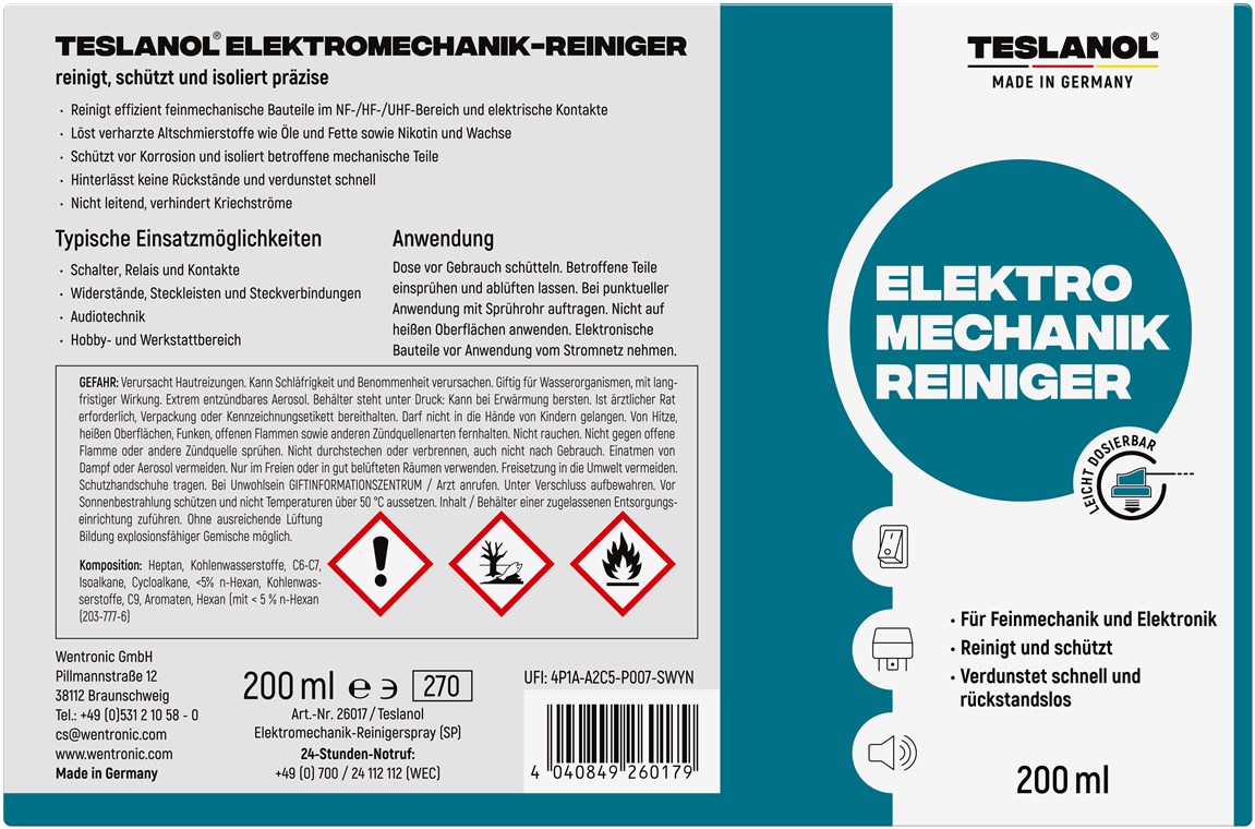 Elektro-Mechanik-Reinigerspray reinigt, schützt präzise, nicht leitend, verhindert Kriechströme verdunstet rückstandslos Das Spray reinigt effizient feinmechanische Bauteile und Platinen im NF-/HF-/UHF-Bereich sowie elektrische Kontakte