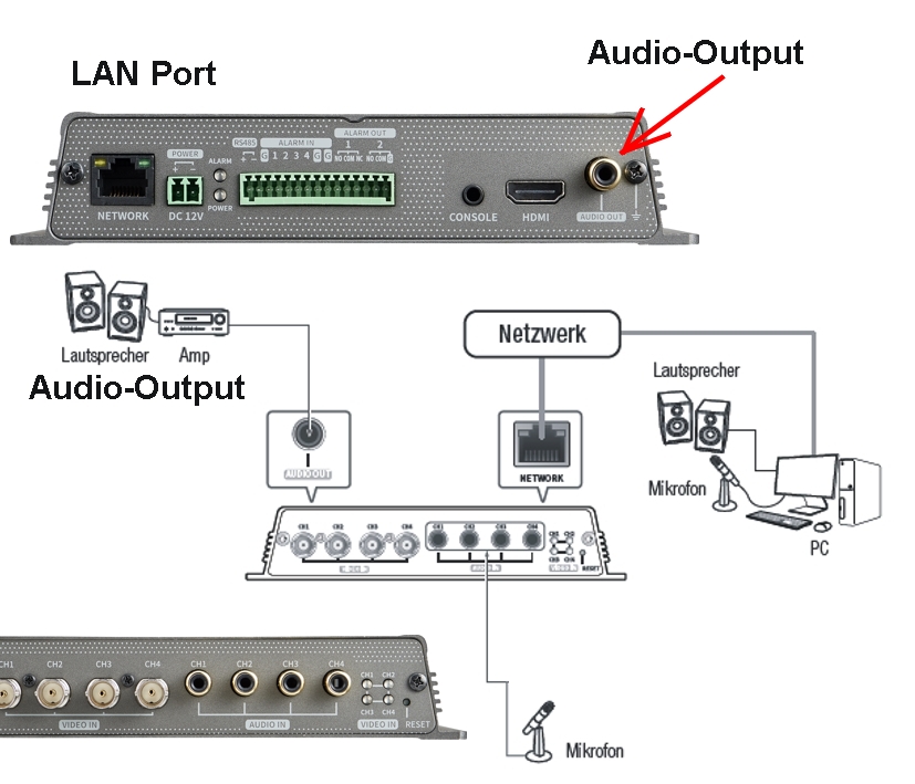 + Audiounterstützung Ja ( 4x Input (Cinch ) + 1x Output ( Cinch ) für aktiven Verstärker z.B. für Durchsagen o.ä. ) Ideal auch für IP-Audio