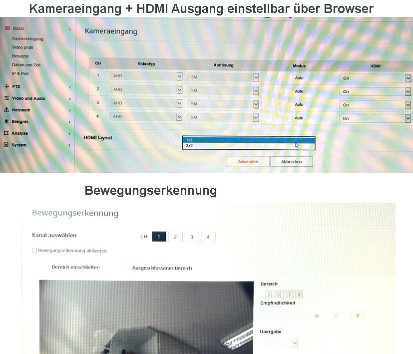 + Videoausgang 1x HDMI-AUSGANG ( 4-fach Bild oder Einzelbild max, 1920 x 1080 über Browser einstellbar )