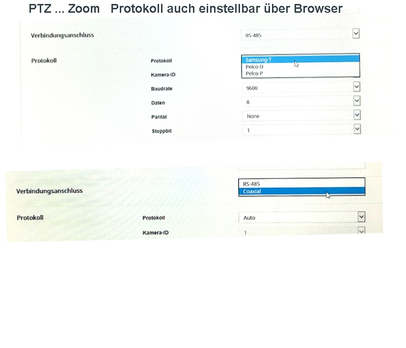 + RS-485-Protokoll 3x SAMSUNG-T + PELCO-P + Pelco-D + oder auch über BNC Coaxitron = Koaxialsteuerung (Pelco-C) AHD, TVI, CVI, CVBS wenn von Kamera unterstützt wird