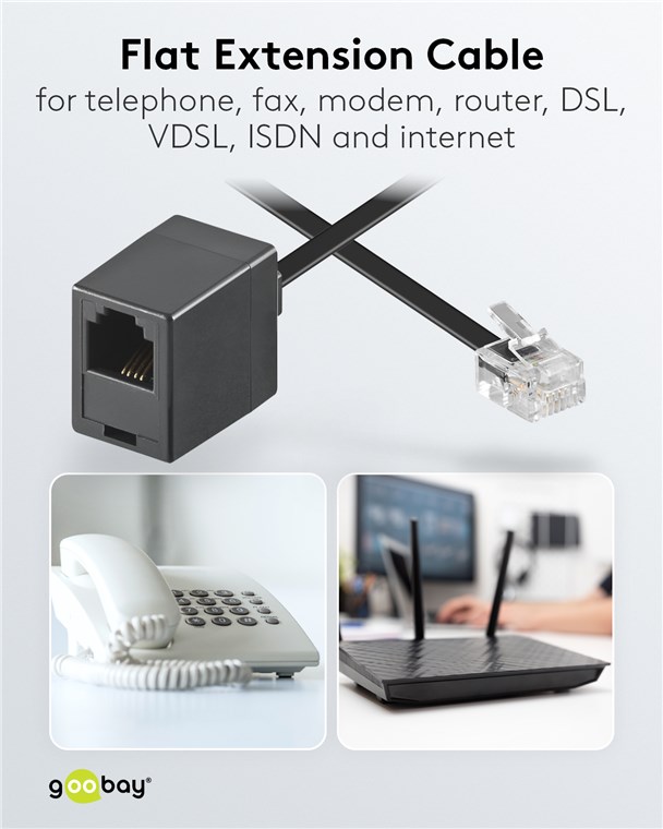 Flaches Verlängerungskabel ist universell für z. B. Telefon, Fax, Modem, Router, DSL, VDSL, ISDN und Internet einsetzbar.