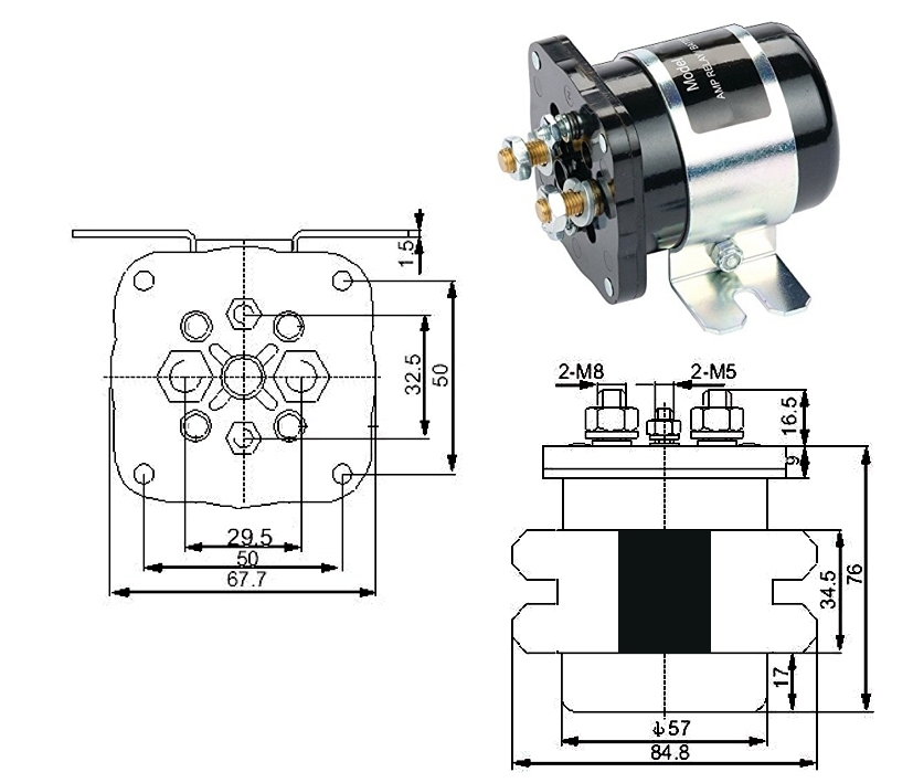 12V 500A Relais Hochleistungsrelais max 700A kurzfristig Hochleistungsrelais für 12V Technik alle Art wie KFZ / Boot / Caravan / LKW / Jeep / Traktor / Transporter / Solaranwendung usw. Ideal verwendbar auch zum schalten großer Lasten wie Seilwinde Leistungspumpe etc. Ideal verwendbar auch für Verstärkertechnik und Lichttechnik wo große Ströme geschaltet werden müssen Ideal auch als 12V oder 24V Trennrelais zwischen Haupt-, und Zweitbatterie z.B. Erzeugt keinen Spannungsabfall bei Umschalten auf die Zweitbatterie Ideal bei Installation von Zweit- oder Zusatzbatterien im Fahrzeug Verhindert die Entleerung der Hauptbatterie Ideal verwendbar als Starterrelais... für Anlasser... oder KFZ-Schütz zum schalten großer Lasten etc. Technische Daten: 12V Hochleistungs Relais ( KFZ Schütz ) Funktion 1x Ein/Aus ( Schliesserkontakt = NO ) Im Stromlosen Zustand ist der Kontakt geöffnet Kontaktbelastbarkeit 500A Dauerstrom / 700A Spitzenstrom Ideal als 12V oder 24V Trennrelais zwischen Haupt-, und Zweitbatterie usw. Der Relaiskontakt ist geeignet für den Einsatz in 12V oder auch 24V Systemen Anschluss des Leistungskontakte über 2x M8 Gewindeanschlüsse ( 2x DM 7,8mm ) Anschluss Hauptkontakt über Ringschuhe oder U-Schuhe Spulenspannung: 12V ( Einsatzbereich = 9V-16,5V DC ) 12V = 0,5A Anschluss der Relaisspule über Kontaktbolzen 2x4,8mm = M5 Bolzen Spule = 34-Ohm ( 9V = 0,372A / 12V 0,497A / 13,8V = 0,753A / 15V = 0,62A ) Funktion des Arbeitskontaktes 1x Ein/Aus ( Schliesserkontakt = NO ) Anschluss des Hauptkontaktes über 2x 7,8mm (M8 ) Bolzen Bemessungslaststrom des Kontaktkreises = 500A Dauer / Peak 700A Schaltschpannung des Lastkreises 6V 12V 24V 36V 48V typisch ( Bereich 6-80Volt ) max Spannungsabfall Arbeitskontakt : 80mV Schutzgrad: IP66 Wasserfest Outdoor tauglich Kontakt schließen = 230ms / Kontakt öffnen = 30ms Temperatur-Einsatzbereich: -30...+80°C 100,000 h - mechanical cycle life Abmessungen siehe auch Zeichnung weitere Bilder Kopfplatte Black = 68x68mm Befestigungsbügel = 34,5x 84,8mm Gesamtlänge mit M8 Gewindebolzen = 93mm Gesamthöhe mit Befestigungsbügel = 74mm * NEU nun auch als 200/400A Version erhältlich = Bst Nr: 47-826-08000 *