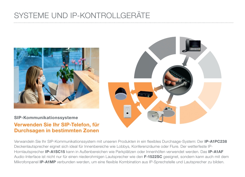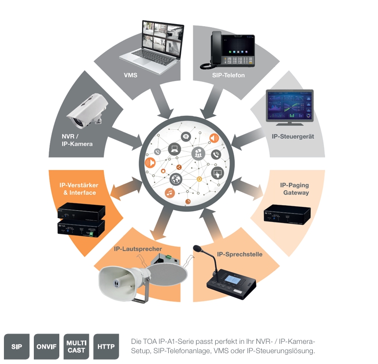LAN PoE Mikrofonsprechstelle IP-Mikrofon IP Paging war noch nie so einfach Anschließen und ausrufen: Die IP-A1RM IP-Mikrofonsprechstelle ist das ideale Gateway für den Bediener Ihrer IP-Beschallungsanlagen-Lösung. Sie bietet ein LCD-Display mit bis zu 50 virtuellen Tasten. Rufen Sie einzelne IP-Audiokomponenten an, führen Sie Gruppenrufe durch, übermitteln Sie voraufgezeichnete Nachrichten und steuern Sie das System über Netzwerkbefehle. Die Kommunikation mit anderen IP-Audiokomponenten erfolgt über das Netzwerk unter Verwendung offener Protokolle, so dass das Systemdesign Ihrer Netzwerklösung keine Grenzen setzt. Einfache Benutzereinstellungen: Eine Vielzahl von Einstellungen können vom Benutzer manuell vorgenommen werden. Wählen Sie Ihr Sendeziel und schalten Sie nach Belieben zwischen verschiedenen Audioquellen um. Sie möchten den Gong spontan aktivieren oder deaktivieren? Sie möchten die gespeicherten Audiodateien vor der Übertragung anhören? Ein Knopfdruck ist alles, was Sie brauchen. Bequeme Aufnahme: Sie sind noch unsicher bei der anstehenden Durchsage, oder Sie wollen nicht immer wieder die gleiche Ansage sprechen? Nehmen Sie Ihre Ansage einfach über das Mikrofon auf, prüfen Sie sie, wiederholen Sie sie bei Bedarf und senden Sie sie dann beliebig oft in die gewünschten Zonen. Einfache Eventplanung: Über die Weboberfläche können Benutzer flexible Zeitpläne für automatische Ansagen oder Töne nach ihren persönlichen Erfordernissen erstellen. Das intuitive Layout und die schnelle Steuerung lassen keine Wünsche offen. Schwanenhalsmikrofon mit LED-Anzeige LCD mit 50 virtuellen Tasten Durchsage über SIP oder Multicast API für den Empfang von HTTP-Befehlen Übertragung ganzer Sätze von HTTP-Befehlen Zeitplaner-Funktion Speicher für voraufgezeichnete und manuell aufgezeichnete Nachrichten System-Stummschaltfunktion zum Stummschalten aller Geräte der IP-A1-Serie im Netzwerk 1x AUX-Audioeingang (Line/Mic) für lokale Audioquellen 2 Steuereingänge und 1 Steuerausgang PoE-gespeist 48V üblichst Spannungsversorgung PoE Leistungsaufnahme 3.5 W Mikrofontyp Unidirektionales Elektret-Kondensatormikrofon Richtcharakteristik Unidirektional Netzwerk I/F : LAN 1x 100BASE-TX (RJ45) Netzwerk Protokoll : TCP/IP, UDP, HTTP, RTP, RTSP, RTCP, ARP, ICMP, NTP, SIP (RFC3261) Audioeingang : 1x AUX (Line/Mic, unsymmetrisch, Mini-Klinke) Steuereingänge 2x spannungsfreier Schließer 1x Stummschaltung über 24V Steuersignal Steuerausgänge: 1x offener Kollektor Ausgang Display LCD, 255 x 160 Punkte mit Hintergrundbeleuchtung Abmessungen: 224 x 47.2 x 136 mm (B x H x T) Ausführung : ABS-Harz, schwarz Betriebstemperatur : 0 °C to +40 °C Gewicht 630 g Erhältliches Zubehör : Wandhalter = WB-RM5000 + PoE Netzteil + PoE Switch + PoE Lautsprecher z.b. PoE Deckenlautsprecher = Art-Nr 88-860-08020 = IP-A1PC238PoE Hornlautsprecher Outdoor = Art-Nr 88-860-08015 = IP-A1SC15 ANFORDERUNGEN AN DEN COMPUTER / Notebook oder ähnliches zum einrichten Empf. Betriebssystem Windows* 10 Pro (64 bit) / Windows* 10 Home (64 bit) / oder höher Windows * 11 ( 32/64Bit ) oder Web-Browser Google Chrome / Microsoft Edge*IP-EINSTELLUNGSWERKZEUG per Download ( TOA Software frei = IP-SettingTool )Mit dem IP-Einstelltool können Sie allen IP-TOA-Produkte auf einmal IP-Adressen zuweisen.Sobald Sie die Netzwerk-ID und Host-ID für den ersten eingestellt haben, weist es automatisch nacheinander IP-Adressen für die übrigen Geräte zu.