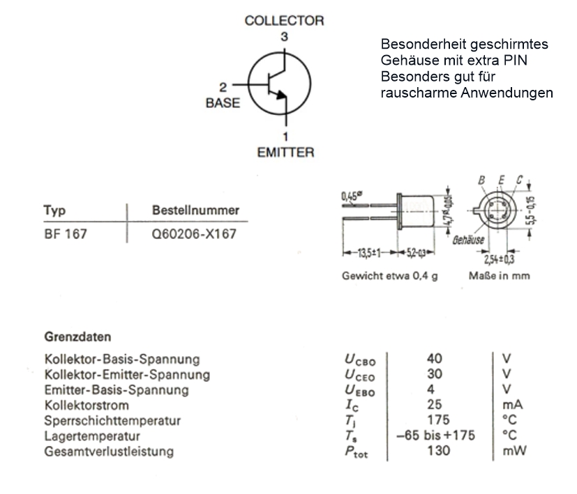 Produktinformationen "BF167 NPN Transistor 30V 25mA 350MHz TO72 4pol mit geschirmten Gehäuse und extra Pin dafür"