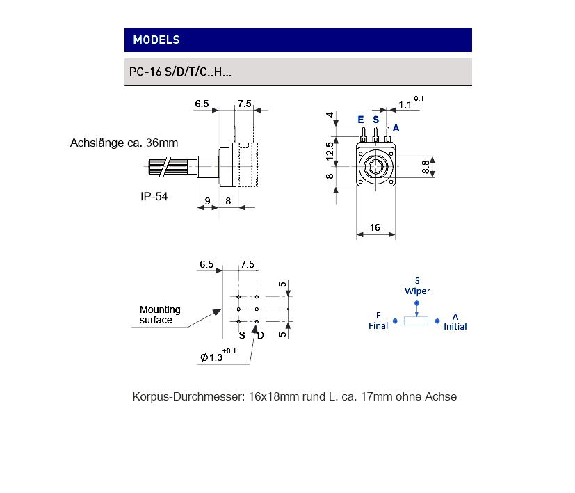 - Staubdicht gekapseltes Poti mit Leiterplattenanschluss
