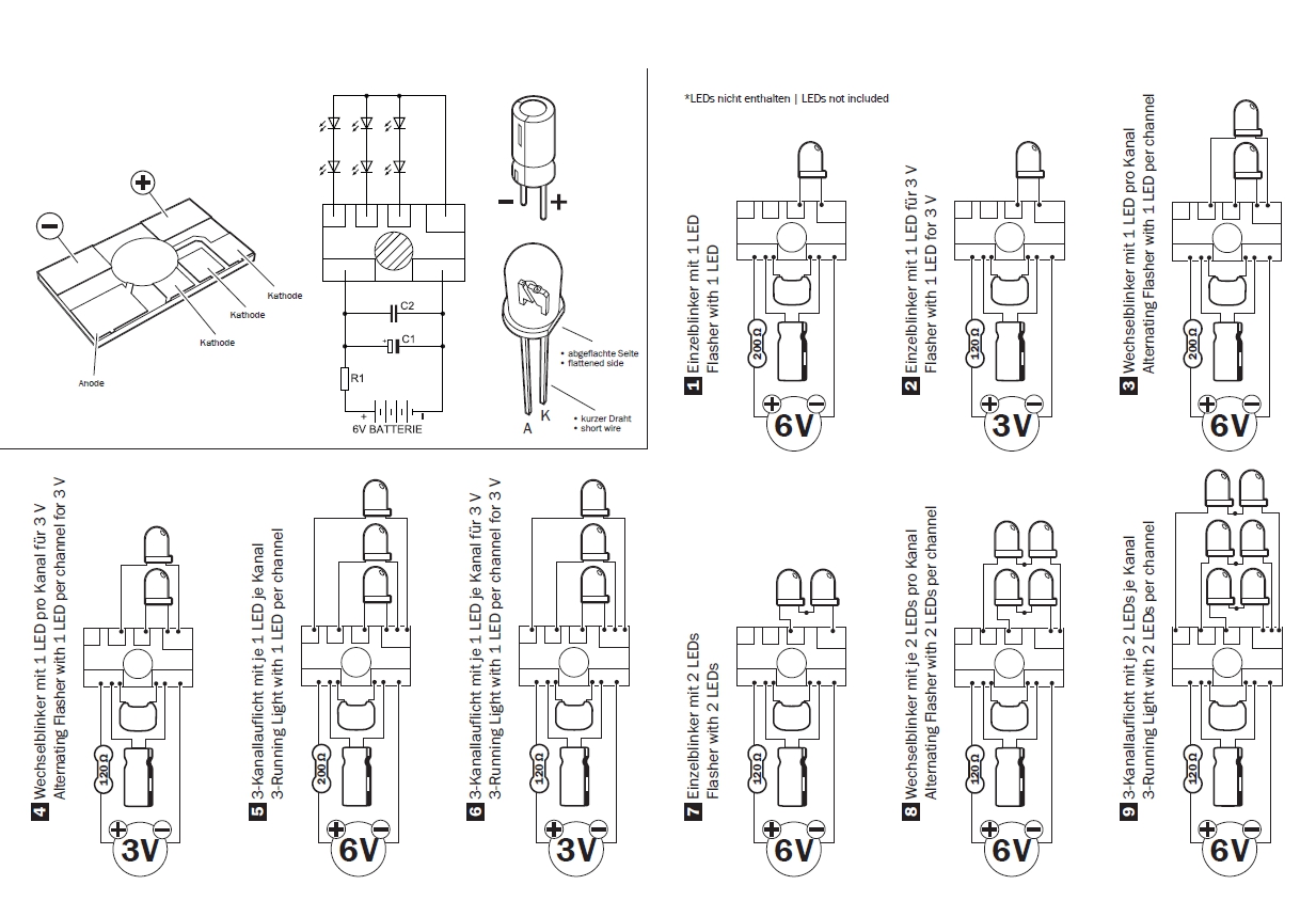 Bei 3V Betriebsspannung kann nur 1-LED je Kanal angeschlossen werden.. Bei 6V Betriebsspannung können max. 2 LEDs je Kanal angeschlossen werden. Außer der Blinkelektronik liegen noch 2 Kondensatoren und 2 Widerstände bei. Von den Widerständen wird jeweils nur 1 Widerstand eingebaut, je nach Betriebsspannung. Die beiden beigefügten Kondensatoren werden gemäß Zeichnung mit der Blinkelektronik verbunden (anlöten). LEDs werden nicht mitgeliefert. Als LEDs können handelsübliche LEDs (rot-grün-gelb) angeschlossen werden, die einen Betriebsstrom von 10 - 20 mA haben und eine Spannung zwischen 1 - 2 V haben.