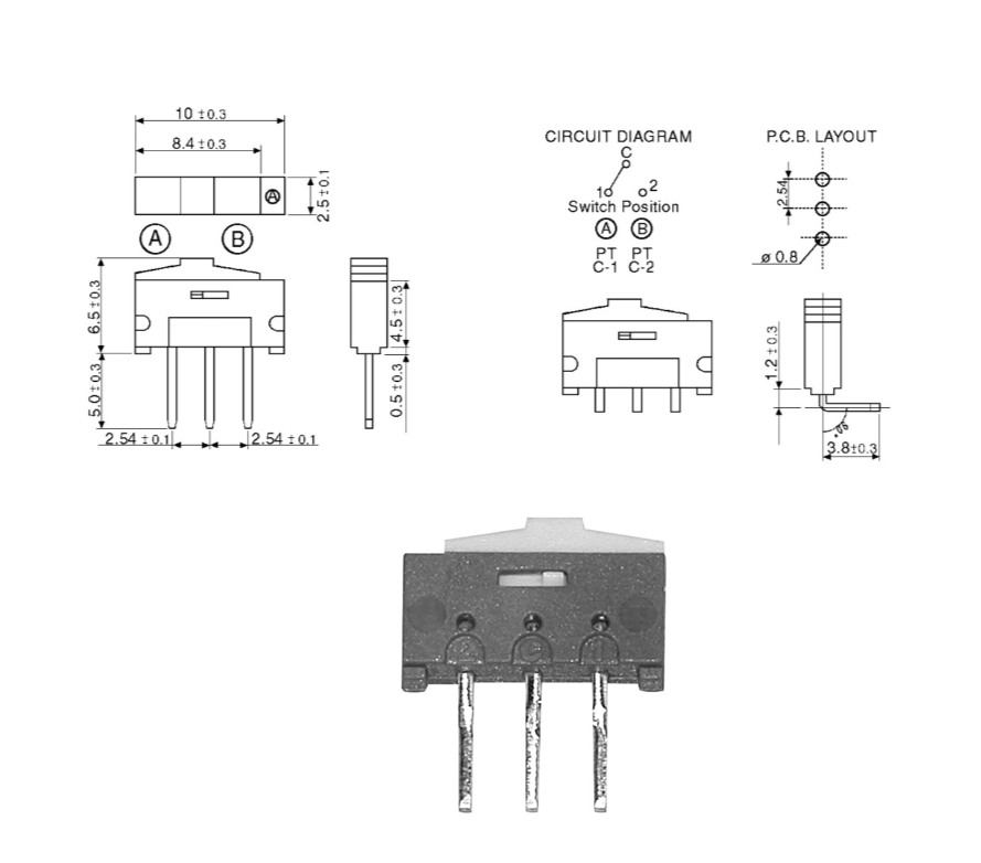 - Abmessungen: B: 10mm T:2,3mm H: 6,5mm RM:2,54mm