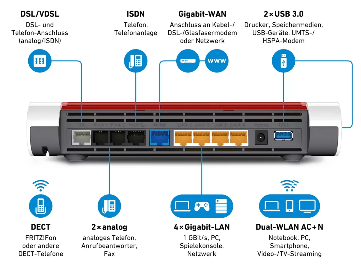- 2 x a/b-Port für analoge Telefone, Anrufbeantworter und Fax