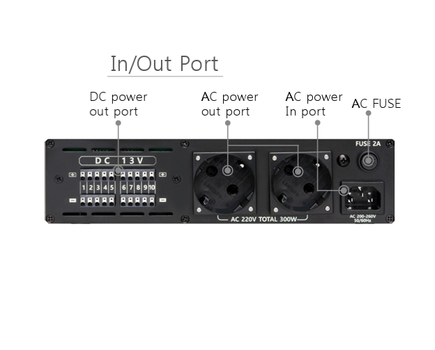 Stromverteilung wie folgt möglich : Spannung stabilisiert mit 10x 13Volt je 0,5A pro Port oder max 1,4A auf Kanal 2-9 ... max 2,5Aauf Kanal 1+10