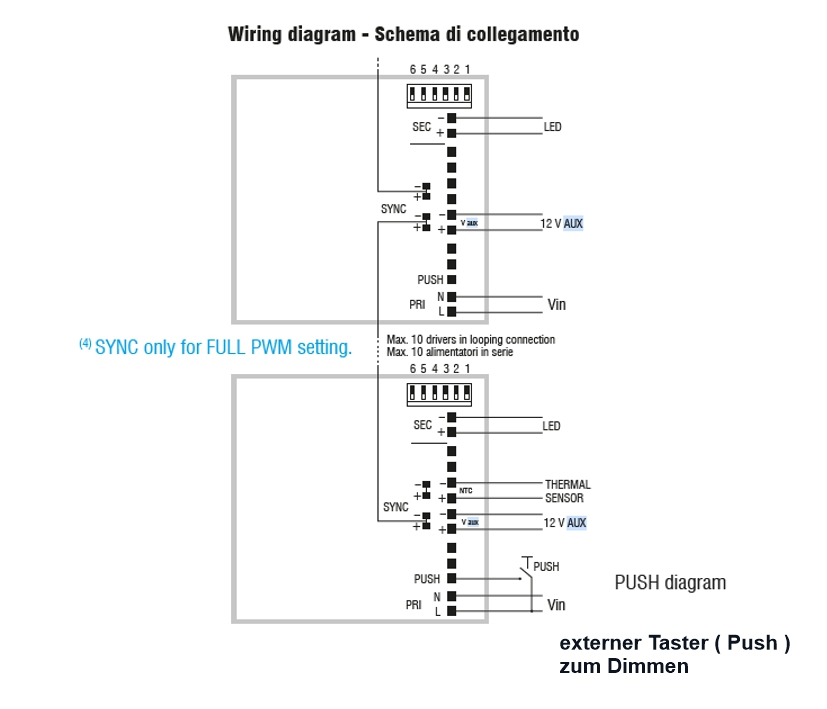 Multifunktionell Ausgangsstrom Konstantstrom also für CC-Lampen wählbar Ausgang einstellbar für stromgesteuert LED Leuchtmittel jeweils über DIP-Schalter wählbar wie folgt bei 250mA bis 28W / 300mA bis 34W / 350mA bis 39W / 400mA bis 45W / 450mA bis 50W / 500mA bis 56W / 550mA-600mA-650mA-700mA bis 60W Dimmbar von 0-100% mittels PUSH-Funktion = Taster kurz drücken zum ein- bzw. ausschalten durch längeres drücken wird die Helligkeit erhöht bzw. verringert Dimmbar von 0-100% mittels 1...10V Steuerspannung von extern Durch die integrierte Sync-Schnittstelle können bis zu 10 Geräte hintereinander geschaltet werden und über das erste gesteuert werden (1 Master + 9 Slave)