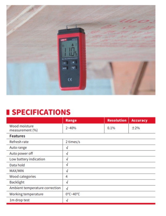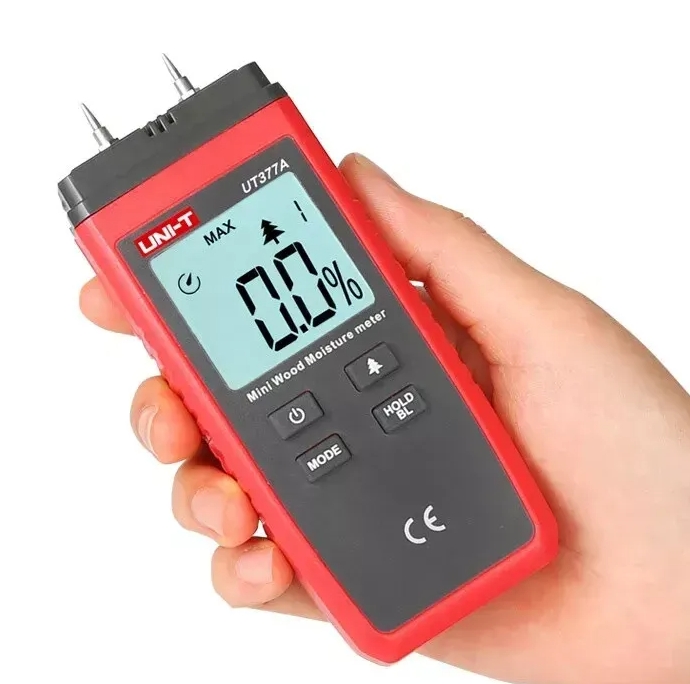 Feuchtemesser Holzfeuchtigkeitsmesser. Das Holzfeuchtemessgerät ist ein unverzichtbares Werkzeug für jeden, der mit Holz oder anderen Holzmaterialien arbeitet. Es misst schnell und genau den Feuchtigkeitsgehalt von Holz, Papier, Sperrholz und anderen Holzmaterialien und klassifiziert das Holz anhand der Materialdichte in vier Kategorien. Sein Feuchtigkeitsmessbereich beträgt 2-40%.