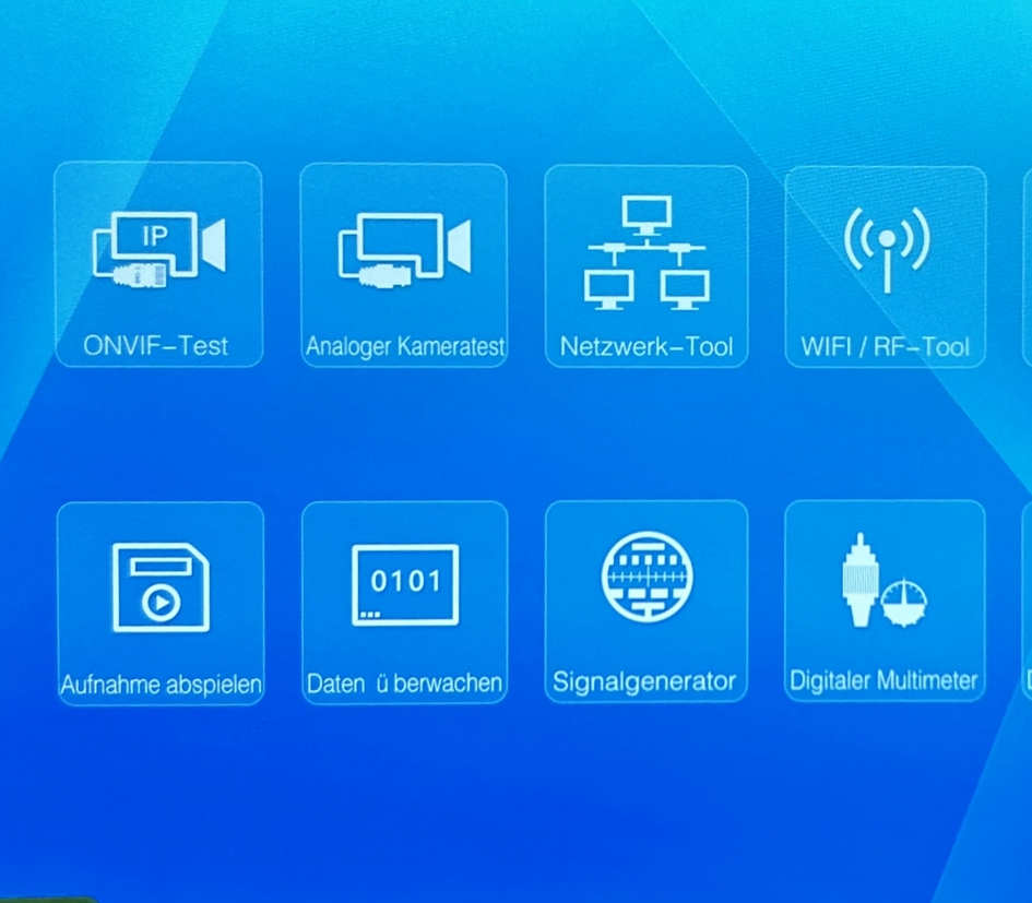 Ideal für Servicetechniker, Industrie z.B. für Maschienekameras und Handwerk Kamera Universalfunktionstester für IP (bis 4K), TVI (bis 8Mpx) , CVI (bis 8 Mpx), AHD (bis 5Mpx) und Analog CVBS Video Signal mit automatische Anpassung an das Eingangssignal Universalfuntionale Kameraanlagen Tester, kompatibel mit IP, TVI, CVI, AHD und analogen CVBS-Kameras. Komplettes Werkzeug für die professionelle Instalation und Aufrechterhaltung von Kameratechnik. Ein Integrierter 7zoll Touchscreen mit eine Auflösung von 1920x1200.