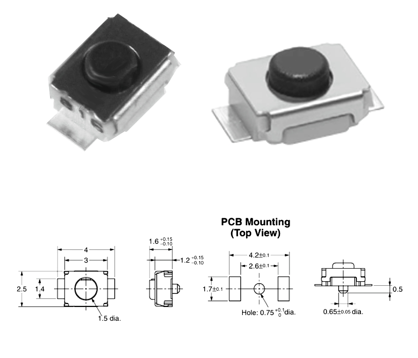 - Gehäuseabmessungen 3,0x2,5mm / 1,6mm Knopfhöhe ( PCB Korpushöhe ca. 1,2mm siehe auch Zeichnung )
