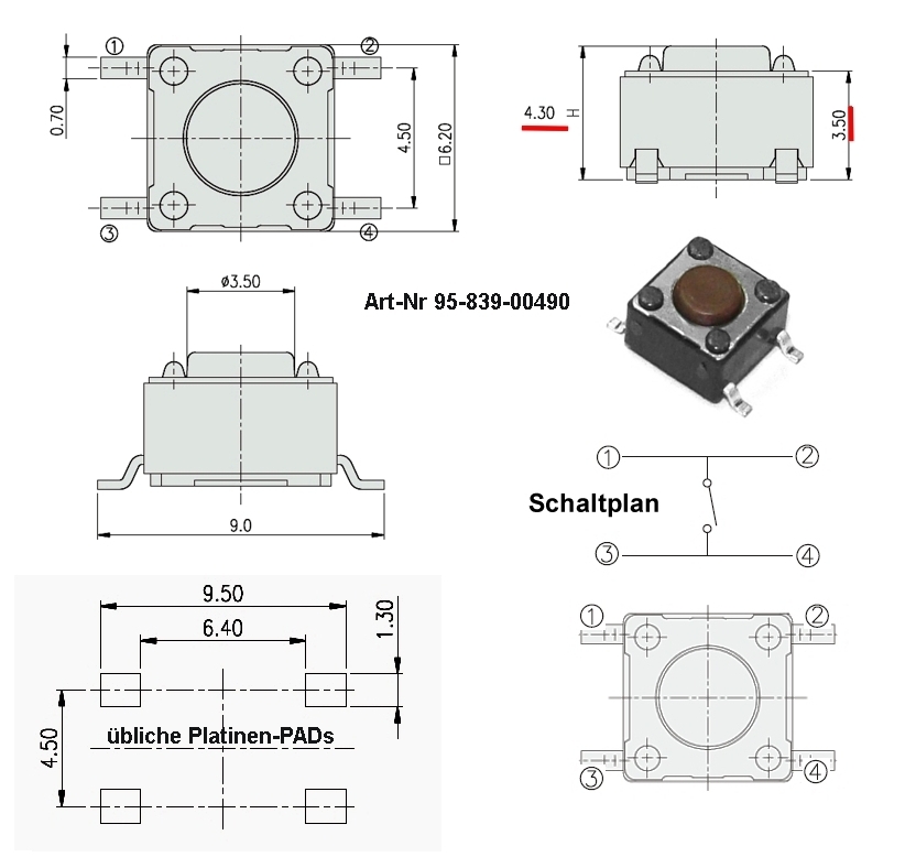 Produktinformationen "SMD Taster Minitaster liegend 6,2x6,2mm Höhe mit Knebel 4,3mm Platinentaster Knopf DM 3,5mm"