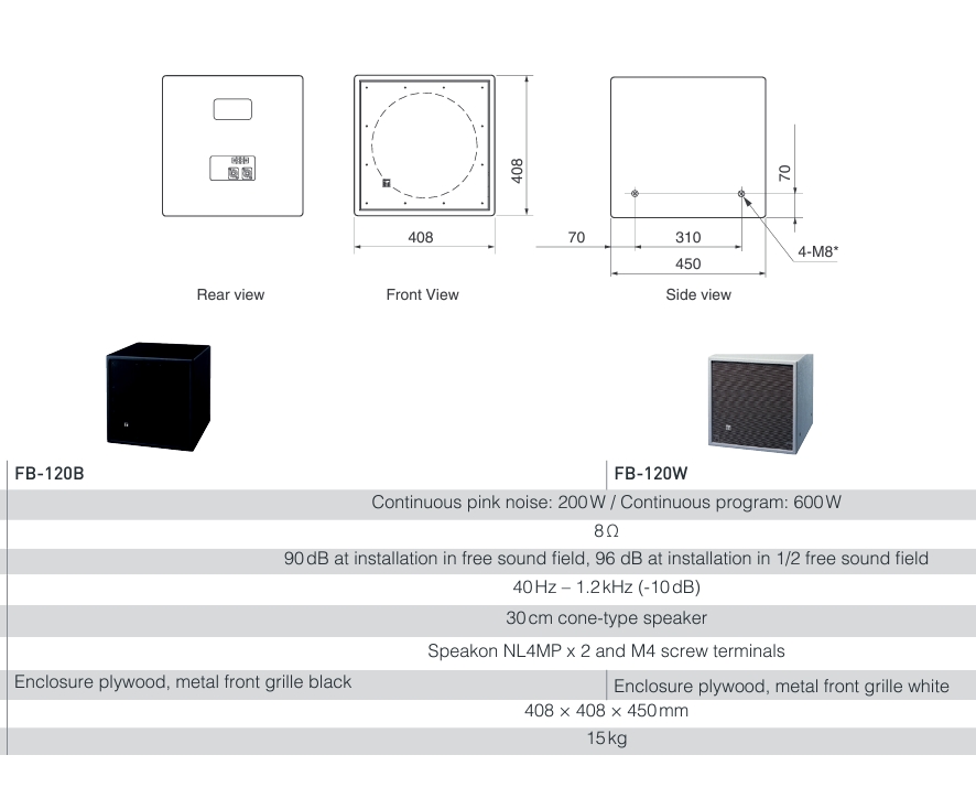 Passiver 600W Subwoofer in Farbe Weiß für druckvolle Bässe + Subwoofer zur klanglichen Abrundung von Audiosystemen aller Art Der FB-120 ist ein kompaktes Indoor-Subwoofersystem mit einem leistungsstarken 30cm (12zoll) Tieftöner. Er ist für den Einsatz in Verbindung mit TOA HX-5-Serien oder anderen Breitbandlautsprechern konzipiert und eignet sich besonders für die Wiedergabe von dynamischem niederfrequentem Klang für feste und temporäre Installationen.Subwoofer mit druckvollem Sound 600W Belastbarkeit ( 8-Ohm ) Ideal in Verbindung mit HX-5 Array Lautsprecher integrierte M8 Gewinde ( 4xM8 ) bereits integriert für M8 Ringschrauben zur sicheren Befestigung ( Rigging ) an Boden-, Wand-, Eck- oder auch Deckenmontage Montagemöglichkeiten siehe auch weitere Bilder ! Tragegriff auf Rückseite integriert 2x Speakon Anschluss und 1x Klemmblock bereits integriert Kaskadierbar zusammen mit HX-5 ( siehe auch weitere Bilder ) Einsatzbereiche zum Produkt: Clubs, Lounge, Verein, Restaurant, Hotel, Auditorien, Mehrzweckhallen, Gebetshäuser Technische Daten: Integrierter Subwoofer 30cm = 300mm ( 12zoll ) Belastbarkeiten: Maximale Belastbarkeit 600Watt max. Nennbelastbarkeit: 200Watt RMS Impedanz: 8-Ohm Frequenzbereich: 40...1200Hz Empfindlichkeit 90dB ( 1W-1m) bei Installation im freien Schallfeld 96dB ( 1W-1m) bei Installation im 1/2 freien SchallfeldGehäuse-Material: sehr stabiles SperrholzLochgitter: Stahl, Gehäuse weiss lackiertAnschlüsse: Speakon NL4MP und 2 steckbarer SchraubklemmenblockAbmessungen: 408 x 408 x 450mm Gewicht: 15Kg Optionales Zubehör erhältlich wie : Art-Nr 85-771-00143 = Subwoofer-Montagerahmen ( HY-PF1B ) Art-Nr 51-750-00370 = M8 RingöseArt-Nr 51-750-00300 = 6mm Fangseil 1000mm = 1m Länge mit Karabiner Art-Nr 51-750-00110 = 3mm Fangseil 900mm = 90cm Länge mit Karabiner Art-Nr 42-685-00270 = 5m Kabel SpeaconkabelArt-Nr 42-685-00280 = 10m Kabel Speaconkabel Art-Nr 42-685-00330 = 20m Kabel Speaconkabel Art-Nr 84-754-01535 = HX5 Arrays 600W 8ohm Black Art-Nr 88-404-00169 = Mischverstärker mit 600W Endstufe ( 480W rms ) = A3548D DigitalZusatzinfo : Neu nun auch als 15zoll 38cm Subwoofer ( 'FB-150B ) erhältlich = Art-Nr 84-754-02750