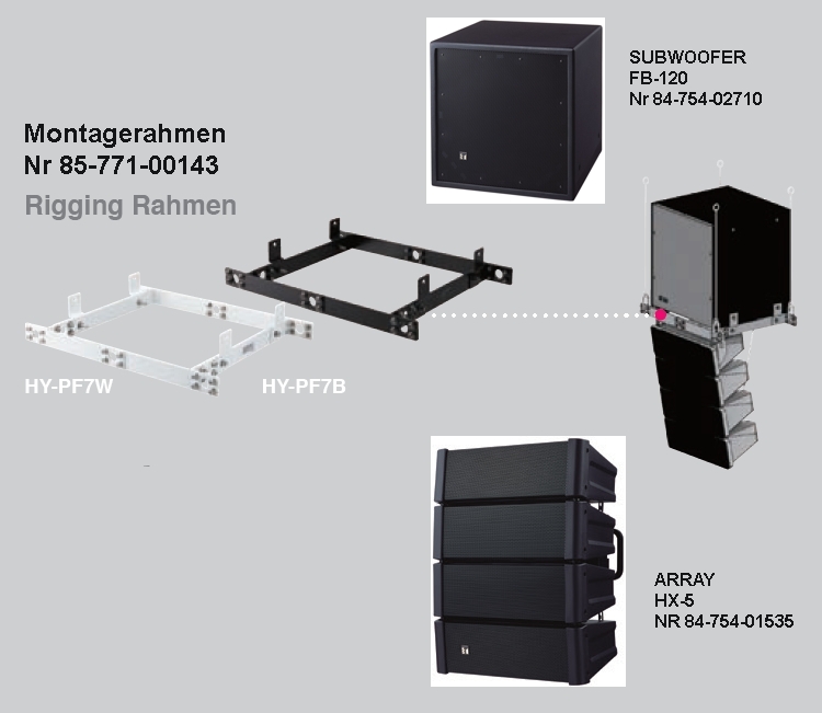 Subwoofer Montagerahmen HY-PF1B Rigging Frame schwarz für HallenmontageRigging Rahmen/Rigging Frame HY-PF1W wird ausschließlich zum Aufhängen des Lautsprechersystems HX-5 an der Decke verwendet. Der Subwoofer der Serie FB-120 kann mit diesem Rahmen und den mitgelieferten Halterungen aufgehängt werden. Diese Halterung ist für den Einsatz im Innenbereich geeignet.Technische Daten:Abmessungen: 550 x 50 x 512 mm ( B x H x T )Ausführung: Stahlblechplatte, halbglänzend, lackiert, schwarz
