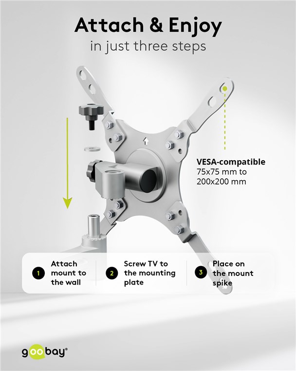 Montagefreundlich: Im ersten Schritt wird der Fernseher an die Montageplatte geschraubt und im zweiten Schritt auf den Dorn der Wandhalterung gesteckt. Die Wandmontage erfolgt schnell und einfach mit dem inbegriffenen Montagematerial (inkl. Wasserwaage für eine präzise Ausrichtung).