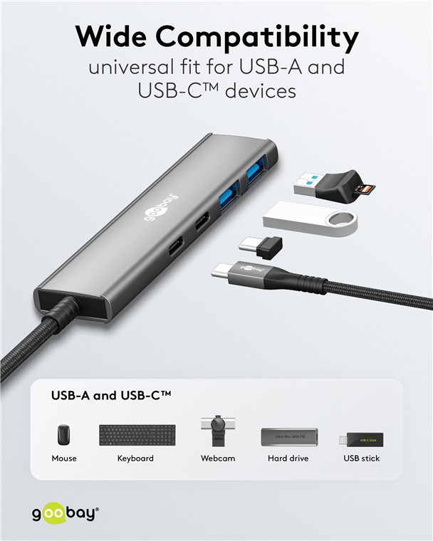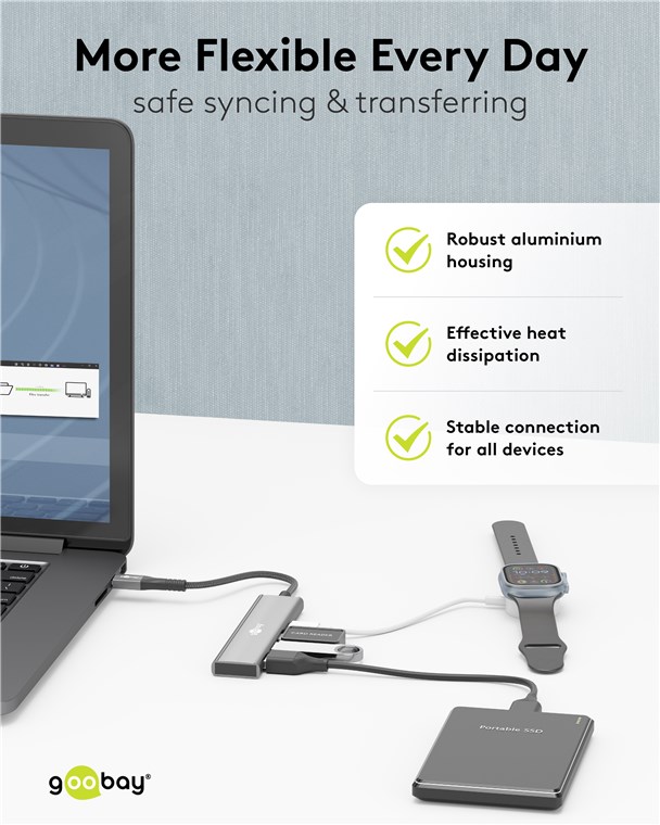 Der Slim-Hub vervielfacht den Anschluss passend für alle USB-A- und USB-C™-Geräte und liefert