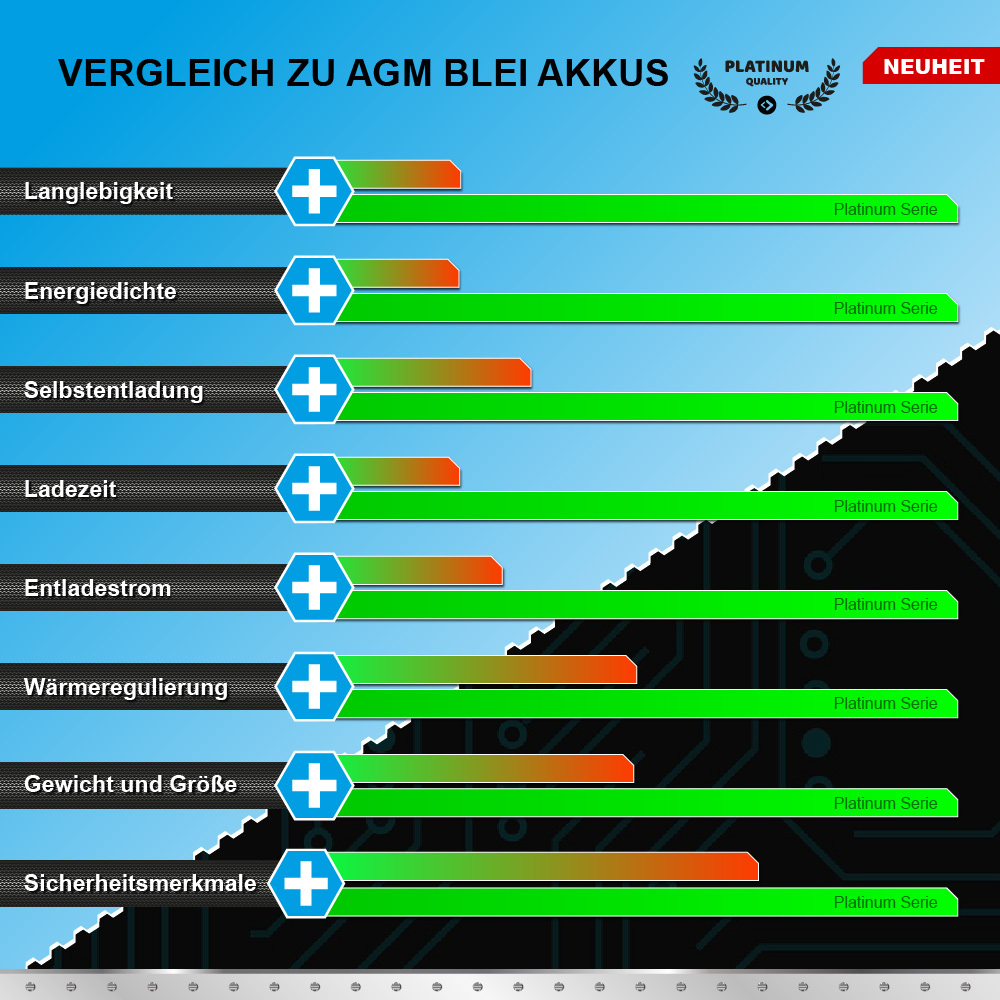 Sie wurden speziell entwickelt, um den hohen neuen Anforderungen an Akkus gerecht zu werden. Die im Vergleich zu AGM Blei-Akkus bis zu 2/3 leichteren LiFePO4-Akkus sind bei schnelleren Ladezyklen trotzdem deutlich leistungsfähiger.