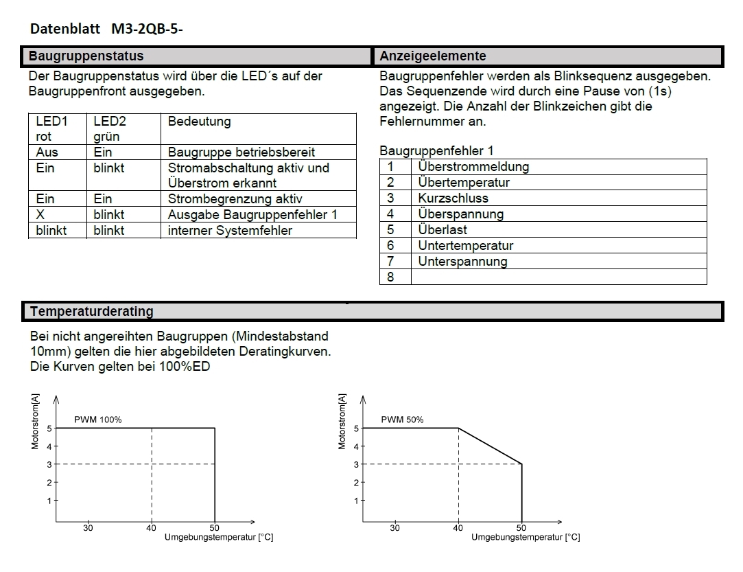 Mittels eines weiteren Digitaleingangs kann die Baugruppe auf 100% PWM Drehzahl umgeschaltet werden. Das Modul M3-2QB-5-12 ist nach Ablauf der angegebenen Startzeit betriebsbereit. Die Startzeit beginnt ab Anlegen der Versorgungsspannung
