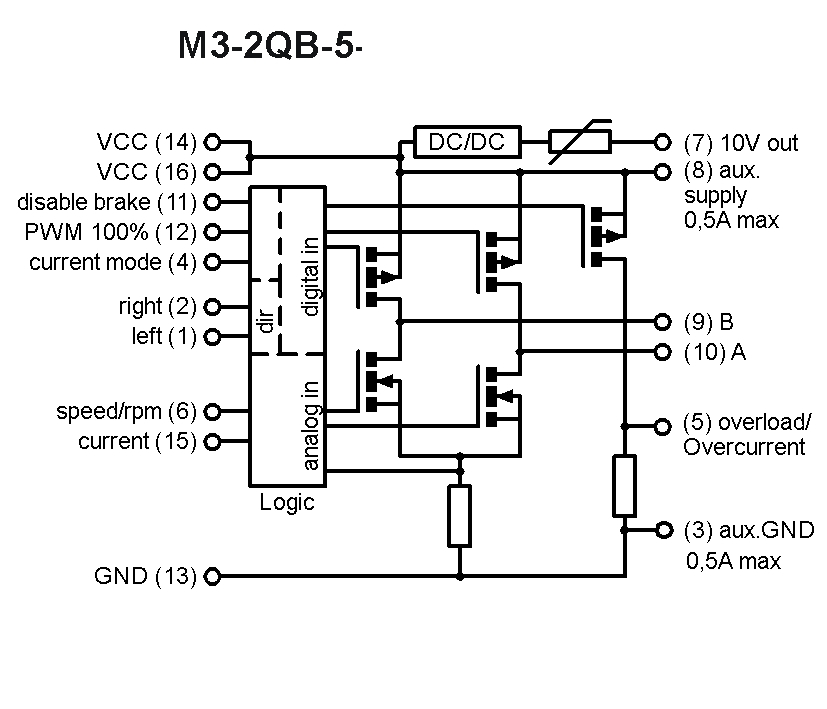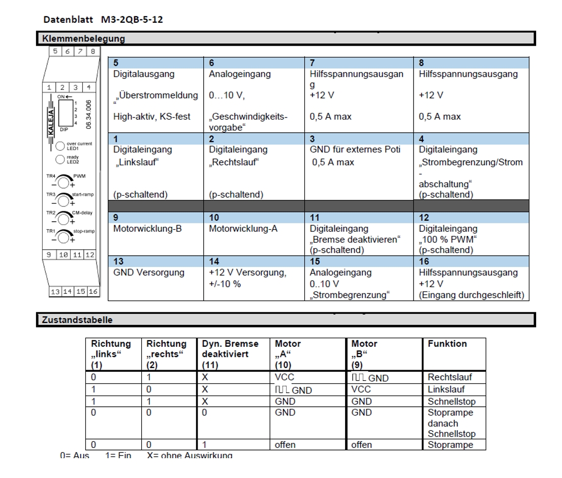 Das Modul M3-2QB-5-12 ist eine 12Volt DC Motorsteuerung zur Verwendung im industriellen Umfeld. Sie gewährleistet das Ein- und Ausschalten, sowie das gesteuerte Antreiben von Motoren. Die Drehrichtung des Motors kann über einen Digitaleingang vorgegeben werden. Durch einen internen Trimmer ( Potis ) kann die maximale Drehzahl eingestellt werden, die über einen Analogeingang noch einmal verringert werden kann, um die Motordrehzahl zu steuern. Die dynamische Bremse kann über einen Digitaleingang deaktiviert werden. Das Modul verfügt über eine einstellbare Start- und Stoprampe und eine einstellbare Ausblendzeit. Der maximale Motorstrom ist über DIP-Schalter einstellbar und kann über einen Analogeingang noch einmal verringert werden. Über einen Digitaleingang kann zwischen der Funktion Stromabschaltung und Strombegrenzung umgeschaltet werden.