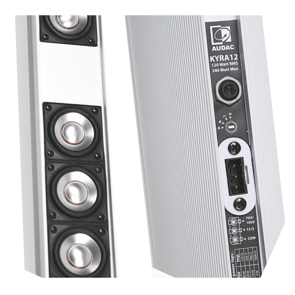 Der Säulen- bzw. Zeilenlautsprecher besitzt 12 hochwertige Aluminiumkonus-Breitbandlautsprecher, die einen außergewöhnlich klaren und detaillierten Klang liefern. Die Gesamtdauerbelastbarkeit erreicht 120W rms, und die Abstrahlwinkel von 170° x 20° machen ihn zur perfekten Lösung für akustisch schwierige Veranstaltungsorte, da er Echos und Mikrofonrückkopplungen reduziert und so die Sprachverständlichkeit in halligen Räumen optimiert. Ein 100V ELA Leitungstransformator ermöglicht den Anschluss an 100V-ELA-Zentralen oder Mischverstärkern mit verschiedenen Leistungsabgriffen für 40W, 20W und 10W und/oder Systeme mit niedriger Impedanz 8-12Ohm.