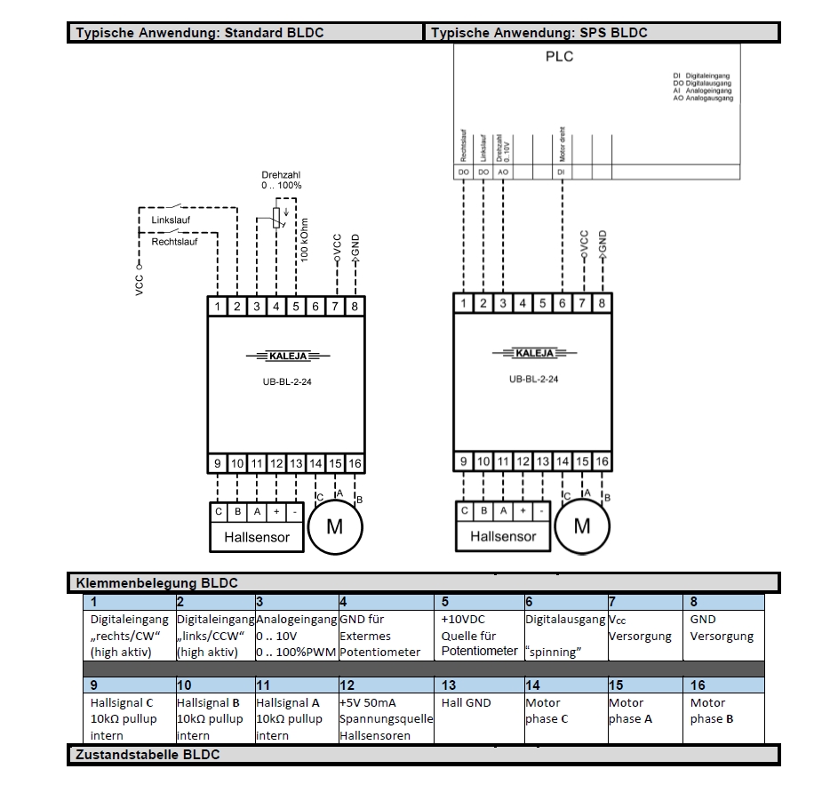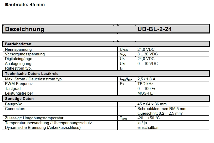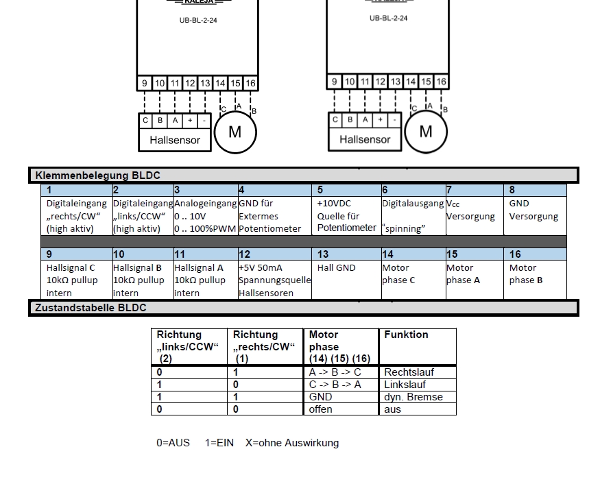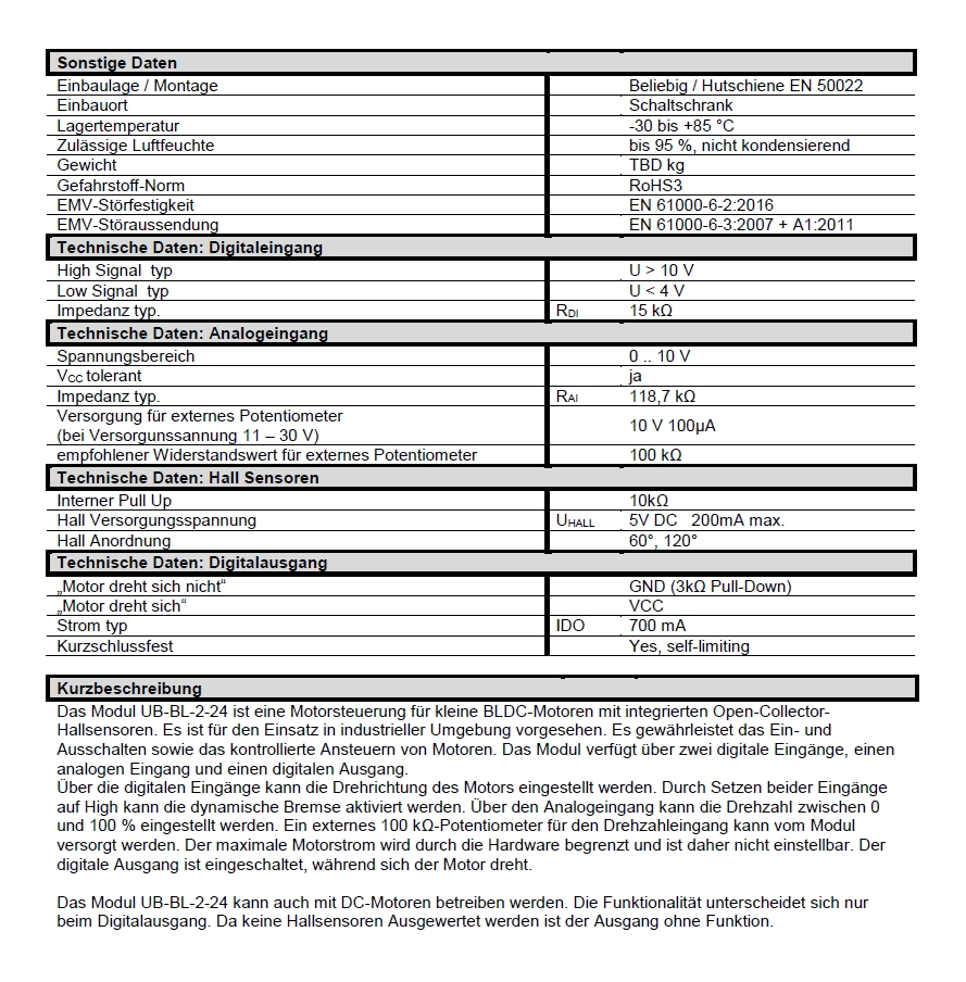 + Das Modul UB-BL-2-24 ist eine Motorsteuerung für kleine BLDC-Motoren mit integrierten Open-Collector-Hallsensoren