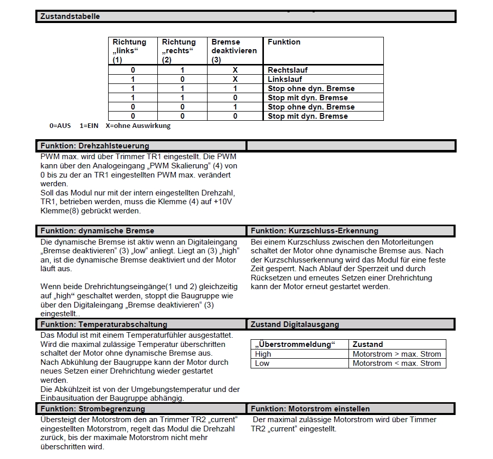 + Poti-Trimmpotentiometer für die Einstellung des maximalen Drehzahlsollwerts (TR1) und Motorstroms (TR2)