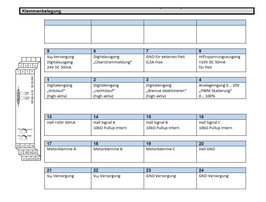 Professionelle Motoransteuerung für bürstenlose Gleichstrommotoren bis 1,8A...2,5A + Ansteuerung über ext. 100Kohm Poti oder 0-10V + Mit Links- Rechtslauf fals benötigt ! Industrielle Motoransteuerung für bürstenlose Gleichstrommotoren ( BLDC-Motor ) und auch DC-Motoren bis 2A + zum Aufschnappen auf die Hutschiene ( DIN Schiene EN50022 35mm üblichst ) + Das Modul UB-BL-2-24 ist eine Motorsteuerung für BLDC- oder DC-Motoren, zur Verwendung im industriellen Umfeld ideal ausgelegt + Das Modul UB-BL-2-24 ist eine Motorsteuerung für kleine BLDC-Motoren mit integrierten Open-Collector-Hallsensoren + Es ist für den Einsatz in industrieller Umgebung Automation usw vorgesehen. + Es gewährleistet das Ein- und Ausschalten sowie das kontrollierte Ansteuern von Motoren. + Steuerung der Drehzahl über Poti oder 0-10V ( siehe auch weitere Bilder ) + Das Modul verfügt über zwei digitale Eingänge, einen analogen Eingang und einen digitalen Ausgang. + Über die digitalen Eingänge kann die Drehrichtung des Motors eingestellt werden. + Durch Setzen beider Eingänge auf High kann die dynamische Bremse aktiviert werden. + Über den Analogeingang kann die Drehzahl zwischen 0 und 100 % eingestellt werden. + Ein externes 100kO-Potentiometer für den Drehzahleingang kann vom Modul versorgt werden. + Der maximale Motorstrom wird durch die Hardware begrenzt und ist daher nicht einstellbar. + Der digitale Ausgang ist eingeschaltet, während sich der Motor dreht. Das Modul UB-BL-2-24 kann auch mit DC-Motoren betreiben werden. Die Funktionalität unterscheidet sich nur beim Digitalausgang. Da keine Hallsensoren Ausgewertet werden ist der Ausgang ohne Funktion Eigenschaften ( Steuerung mit folgenden Funktionen ) + Drehrichtungsumkehr + Drehzahlsteuerung mit Analogeingang + Ein externes optionales 100kohm Potentiometer für den Drehzahleingang kann vom Modul versorgt werden. + 1x Analogeingang 0-10VDC + Überstrombegrenzung + Dynamische Bremsung zuschaltbar + Temperatur geschützt + Digitalausgang ( Motor dreht ) + 10V Referenzspannung + Einbauart: Schaltschrank typisch + Klemmen ( Schraubklemmen ) für Kabellage 0,2...2,5qmm zum aufschnappen auf die übliche 35mm Hutschiene ( EN50022 ) Technische Daten : Nennspannung / Eingang typisch: 24Volt DC ( Range 8-30V DC ) Dauerlastrom 1,8A max Strom 2,5A Analogeingänge 0-10VDC ( Dcc tolerant Ja ) Impedanz : 118,7Kohm Empfohlenes Widerstandwert für externes Potentiometer : 100Kohm Versorgung für externes Poti 10V 100uA ( Range 11-30V ) Digitaleingang : HighSignal : U 10V / Low Signalk U : 4V / Impedanz: 15Kohm PWM-Frequenz : Fs = TBD Khz Tastgrad 0-100% Lastkreis Ausgang : MOS-FET Dynamische Bremsung ( Ankerkurzschluß ) einschaltbar Ja Temperaturüberwachung Ja Überspannungsschutz Ja Temperatureinsatzbereich : -20°C ... +85°C Erfüllt Normen : EMV Störfestigkeit EN61000-6-2: 2016 EMV Störaussendung : EN 6100-6-3: 2007 + A1 2011 ROHS Ja Gehäuse: UL94V-= Kunststoff Abmessungen : B: 46 x L: 64 x H: 36mm Anschlüße und weitere Daten siehe weitere Bilder ! bzw. Datenblatt Zubehör erhältlich Hutschiene , 100K Poti, 24V Netzteile ... usw. ( siehe im Zubehör-Register )