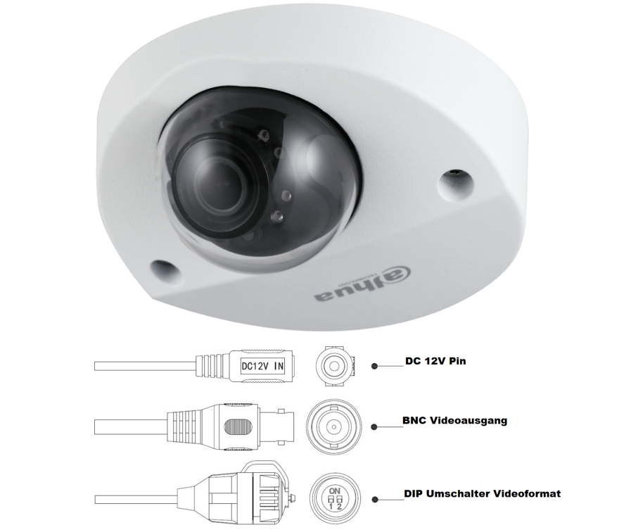 4MP Domekamera AHD , CVI , TVI oder Analoger Ausgang über BNC 4-Megapixel IP67 Outdoor HD Diese Domekamera der Pro Serie ist eine tolle Kombikamera mit 4in1 Technologie. Analog und HD Standards wie TVI / AHD und CVI in einer Kamera die im IP67 Wetterschutzgehäuse untergebracht ist. Rückwärtskompatibel ! Analog und HD in einer Kamera ! Umstellbar per DIP-Schalter, UTC oder oder im OSD Menü. Ersetzt in dieser aktuellesten Ausführung alle alten Vorgängermodelle mit analogem FBAS Video Ausgang. Zudem dat dieses Domekamera ein Mikrofon bereits integriert ! 4in1 Kamera Analog-HD-Videoausgang (TVI 1080p/ AHD 1080p/ CVI 1080p), alternativ auch CVBS-Videoausgang (PAL, 1000TVL)Einsatzumgebung, Gehäuseschutzart IP67 Outdoorgehäuse für den Innen- und Außenbereich 4in1 HD Zylinder Kamera für die Decken- oder Wandmontage Dome-Kamera für den Innen- oder Außenbereich Schutzgrad IP67 Sensor 4MP Starlight Chip mit DSP 4MP Domekamera für den Outdoor oder Indoorbereich Signalart CVI / AHD / TVI / Analog ( CVBS ) über BNC Kabel RG59 Mikrofon integriert ( abschaltbar über OSD ) jedoch ohne Mikro-Ausgang da über Koax Kein Mikrofonausgang separat da über selbes KOAX der Ton läuft wie das Bildsignal zum DVR 2,7...13,5mm motorisiertes Objektiv Auflösung HD 2MP(1920x1080) 25fps@1080p, 25fps@720p HD oder SD Ausgabe (über OSD Menü) Multiformat HDCVI / TVI / AHD /CVBS (Umschaltung nur über DIP Schalter an Kabelpeitsche) Audio Eingang und eingebautes Mikrofon (deaktivierbar im OSD Menü) 120dB True WDR, 3DNR, BLC, HLC, WDR Max. IR Nachtsicht-Reichweite bis 60m, Smart IR Schutzgrad IP67 Stromversorgung DC12V Max Auflösung 1080p Effective Pixels 1920(H)×1080(V), 2MP FullHD Bildsensor 1/2,8" CMOS Blendenöffnung F1,6 Lichtempfindlichkeit 0,005 Lux Lichtempfindlichkeit (IR an) 0 Lux IR LED Beleuchtungsdistanz bis 60m Objektiv Typ motorisiert Brennweite 2,7 - 13,5 mm Blickwinkel (H) 99° - 28° / Blickwinkel (V) 53° - 16° Bildrate FullHD 1080p 25 FPS / Bildrate 4MP 25 FPS WDR 120dB Video Ausgang 1x BNC Ausgang Multiformat HDCVI / TVI / AHD /CVBS (Umschaltung nur über DIP Schalter an Kabelpeitsche) Spannungsversorgung DC 12V oder AC 24V Audioschnittstelle 1 Kanal In & Eingebautes Mikrofon über KOAX zum DVR Schutzart IP67 ALU Gehäuse Farbe Weiss Vandalensicher IK10 Betriebsbedingungen -30°C ... +60°C / Weniger als 95% relative Luftfeuchtigkeit Besonderheit Starlight / Audio Eingang , eingebautes Mikrofon Mikrofon Ja Abmessungen: Durchmesser: 122mm Höhe: 104mm Optional erhältlich fals benötigt 79-245-00120 = UTC Koax Fernbedienung für das On-Screen Menü in der Kamera ( oder über Koax DVR einstellen ) 79-224-02930 = ALU Kabelverteilerkasten mit div Bohrungen und Kabeleinlassmuffe 79-400-00188 = Masthalter / Rohrhalterung BNC Kombikabel mit Steckern in diversen Längen und auch als Meterware erhältlich 12V Netzteil, DVR Rekorder, Konverter .... Lieferung: Kamera mit Anleitung ( Netzteil optional ) Zusatzinfos zur Anwendungen mit Software und APP Smartphone APP für iPhone (IOS) und Adroid per Download in ihrem App-Store und dann über Fernzugriff Ja über Rekorder mit LAN-Anschluß dann APP für IOS oder Android per Download Das System wird abgerundet durch eine P2P App für Tablet oder Smartphones ( App = DMSS / iDMSS ) Windows Software für PC-Computer-Rechner per Download kostenfrei Fernansicht .. Fernzugriff auch möglich über Webbrowser (ActiveX ) Browser kompatibel zu Mozilla, Chrome, MS-Explorer ... u.a. CMS-PC Software per Download ( Smart PSS / DSS / DMSS ) bedingt auch über andere APPs die Onvif kompatibel sind