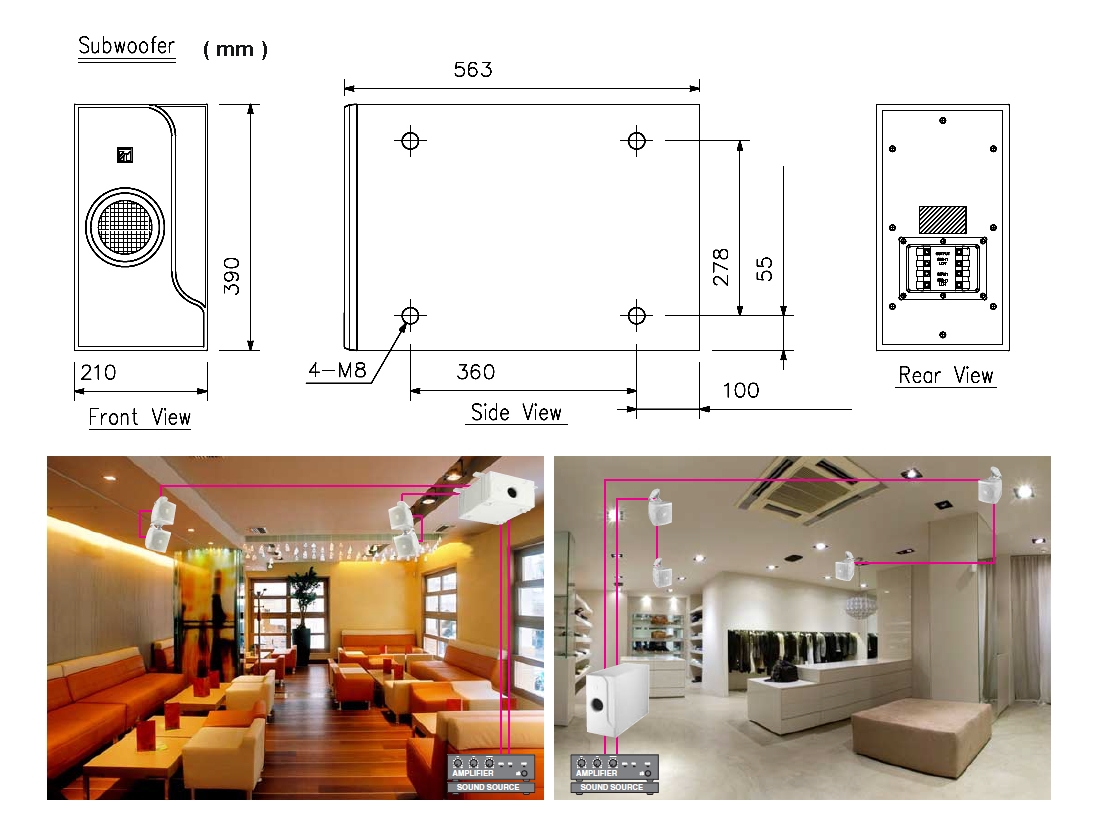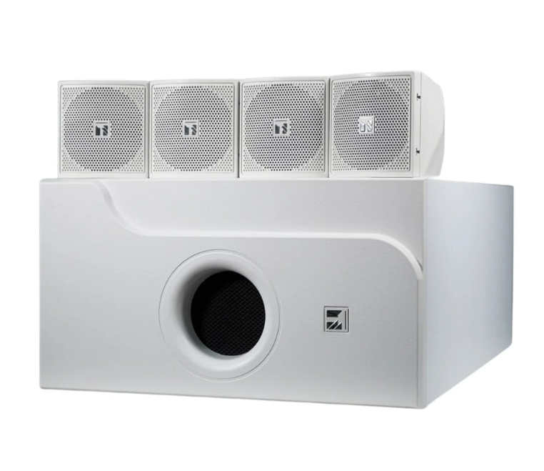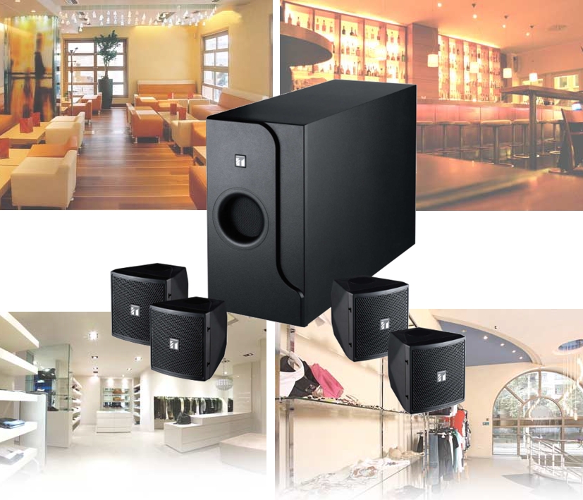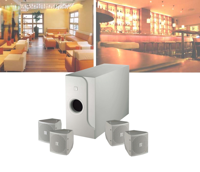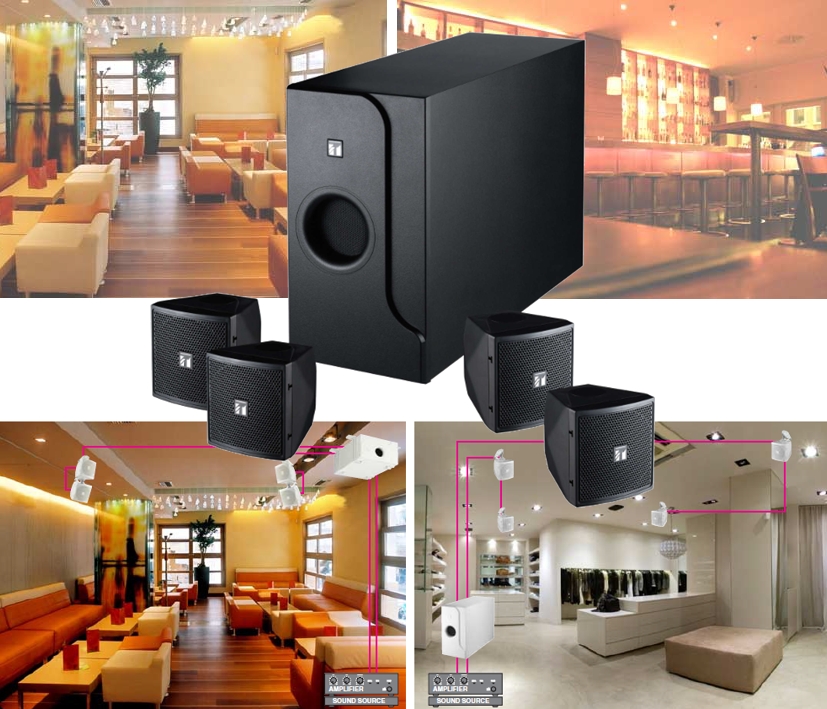 Das kompakte 4er Satelliten-Lautsprechersystem kann effektive akustische Klänge in kommerziellen Räumlichkeiten wie Restaurants, Cafés, Bistro und Einzelhandelsgeschäften erzeugen.