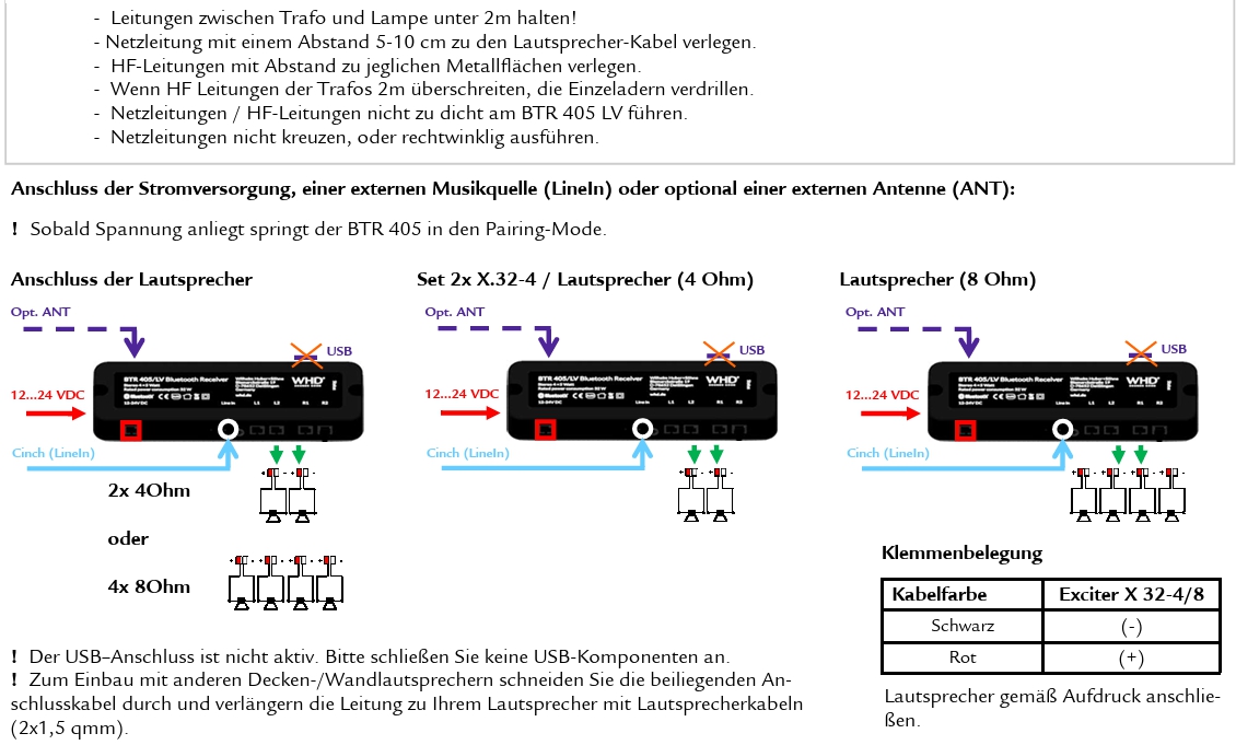 Der BTR405 LV ist ein 12-24V - Bluetooth Empfänger, mit Anschlüssen für bis zu 4 Lautsprecher/Exciter, der versteckt in Decken, Möbeln und Wände verbaut werden kann. Genießen Sie Ihre Lieblingsmusik von Ihrem Smartphone, Tablet oder Laptop per Bluetooth über die angeschlossenen Lautsprecher oder Resonatoren/Exciter. Zusätzlich kann auch die Musik vom CD-Player, Radio oder einer Stereoanlage über den integrierten Line In gehört werden.