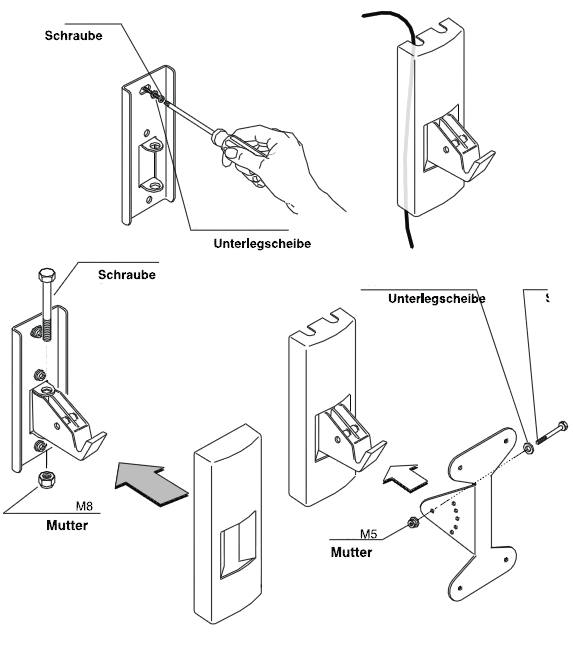 Einfach auf die Rückseite ihrer Boxen anschrauben (Schrauben anbei) und die zweite Hälfte des Halters an die Wand befestigen - Boxen ansetzen und Schraube seitlich eindrehen - fertig !