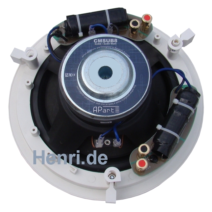 2-wege 205mm Deckenlautsprecher in HiFi Pro Qualität mit schönem flachem stilvollen Design. Kompakt und elegant. Passt zu jeder Einrichtung und Ausstattung dank randlosem Design. Dank der einfachen Montage und der herausragenden Klangreproduktion haben sich diese Lautsprechersysteme bestens bewährt. 2-wege Einbaulautsprecher in runder Bauform. Großartiger Klang in ansprechendem Design. 2-wege Deckenlautsprecher in HiFI Pro Qualität mit schönem, flachem Design. Passt zu jeder Einrichtung und Ausstattung. Dank der einfachen Montage und der guten Klangreproduktion, haben sich diese Lautsprechersysteme bestens bewährt. Dank des gesamten Ausführung wie Aluminiumgitter Membrane usw sind die Lautsprecher auch in feuchter Umgebung ( IP50 ) wie Terassen, Bad usw. bestens einsetzbar. Der integrierte 2-Wege-Lautsprecher mit niedriger 16-Ohm Impedanz eignet sich hervorragend für die Verteilung von Haupt- und Hintergrundmusik in allen Räumen. Es liefert einen warmen Hintergrundklang und kann mit einem Standard-HiFi-Verstärker verwendet werden wenn der 100V Übertrager abgebaut wird. Dieser Lautsprecher ist einfach zu installieren. Er verfügt über einen praktischen Quick-Fit-Anschluss sowie eine Ein- und Ausgangsklemme für den Anschluss von Lautsprecherkabeln bis 2,5qmm. Das RAL-lackierbare, dünne Kantengitter ermöglicht die problemlose Integration in jedes Interieur. Dieses System ist eine sehr schöne Designversion unserer Referenz-Einbaulautsprecher Technische Daten: 2-wege System mit 165mm Tieftöner und Softdome Kalottenochtöner Leistung: 60Watt Musikleistung bzw. 30Watt Sinus Impedanz 16-Ohm Frequenzbereich: 60.....20.000Hz ( bei guten Resonanzraum bereits ab 25Hz ) Empfindlichkeit: 1W/1m: 86dB / Max Peak: 104dB Integrierter 100V Übertrager für 100V Anlagen mit folgenden Leistungsbegrenzernanzapfungen 20W / 10W / 5W rms Abstrahlverhalten: H: 180° (1Khz) / V: 80°(4Khz) Frequenzweiche bereis integriert Die Montage bzw. Demontage erfolgt nur durch das anziehen von Schrauben, die nach Abheben des Lochbleches durch kleine Magnete zugänglich sind. Kabelanschluss über Lüsterklemme bis 2,5qmm Abmessungen: Aussendurchmesser: 210mm Einbaudurchmesser: 186mm Einbautiefe: 80mm Gewicht je Stück: 1,25Kg Farbe: Weiss RAL9010 eher Reinweiss Schutzgrad IP50 Optional erhältlich Einbautopf fals benötigt = Bst Nr 85-771-00590 Diese Deckenlautsprecher-Serie mit dem randlosen Design sind in folgenden Ausführungen erhältlich : Bst Nr 88-500-07820 = CM1008D = 250mm 8,0zoll 2-wege 100/60W 8-Ohm Bst Nr 88-500-07711 = CMX20DT = 250mm 8,0zoll 2-wege 100/60W 16-ohm plus 100V Übertrager 20-10-5W rms