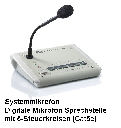 VLM205 Systemmikrofon mohne Steuerplatine nur passend zu Verstärkermodellen mit 5-Zonensteuerung von RCS Diese digitalen Mikrophon-Sprechstelle ermöglicht die Fernbedienung der ELA Zentrale. Die Sprechstelle bedient die 5 Lautsprecher-Kreise und das Kondensator-Mikrophon (Nierencharakteristik) mit Vorgong. Bei diesem 205er Modell kann außerdem noch das Digital-Textmodul (wenn im Verstärker integriert) fernbedient werden. Bei einer Gesamt-Leitungslänge von bis zu ca. 100m können bis zu 5 dieser Tischmikrofone mit Zonen-Fernbedienung können maximal an die Steuerplatine angeschlossen werden; bei Leitungslängen von jeweils bis zu 250m jedoch nur 3 Stück. Die gewünschten Prioritäten sind jeweils an der Geräte-Rückseite einzustellen, ebenso die gewünschte Lautstärke. Ein AUX-IN (L+R, Chinch) ermöglicht Einschleifen von CD-Player, Tuner, Bluetooth, MP3 Player etc. 3m Datenkabel ( 8pol. ) mit RJ45 Steckern und die Steuerplatine für den Einbau in passenden Zonenverstärker sind beigefügt Lieferumfang: 1x Tischmikrofon mit Schwanenhals im Metallgehäuse 1x 3m LAN-Kabel Cat5e mit 2x RJ45 Stecker Zum durchverdrahten von 1-6 Sprechstellen auf einen RJ45 Port an der Endstufen-Rückseite empfehlen wir folgende Produkte hierzu ( Somit einfacher für die 1:1 durchverdrahtung der Schnittstelle ) Bst Nr 53-800-00975 = 8-fach Patchverteiler 10zoll ( 8x RJ45 Buchsen zum durchverdrahten hinter der Zentrale bzw. Endstufe ) Bst Nr 53-800-00772 = 12port Patchfeld LSA Technik ( 10zoll ) Bst Nr 53-800-01035 = 24port Patchfeld LSA Technik ( 19zoll ) Bst Nr 97-905-00630 = LSA Auflegewerkzeug oder auch bei wenigen Tischmikrofonen mit RJ45 Steckern Bst Nr 76-686-00045 = RJ45 Verteiler 1xRJ45 auf 4x RJ45 ( 1:1 vorverdrahtet ) Info zur Serie neuen Serie ab 2021: VLM-100 = nur 1x RJ45 Buchse und 2x DIP Schalter auf der Rückseite ( siehe auch weitere Bilder ) Info ab 2021 = VLM100 ersetzt auch den Vorgänger VLM100A VLM-100A = war RJ45 und 7pol DIN Buchse für alte Verstärker Serie ( Auslauftype ) Folgende Ausführug der Mikrofon Sprechstellen ( bzw. weitere Sprechstellen ) sind erhältlich je nach Verstärkerart 5-Zonen... 6-Zonen...12-Zonen Fragen Sie uns einfach danach 07362-919093 Nun 1-Zonen Mikrofon für 5-Zonen Verstärker Bst Nr 88-799-00805 = VLM-100A Sprechstelle nur 1x Sprechtaste ohne Zonentasten mit RJ45 + 7pol DIN Anschluss Nun 5-Zonen Mikrofone nur für 5-Zonen Verstärker Bst Nr 88-799-00810 = VLM-105 5-Zonen Sprechstelle mit RJ45 Steuerplatine für Verstärker weitere 5-Zonen Mikrofon wie VLM-105 jedoch ohne Steuerplatine Bst Nr 88-799-00811 = VLM-105-WO 5-Zonen nur weitere Sprechstelle ohne Steuerplatine Nun 5-Zonen Mikrofone nur für 5-Zonen Verstärker mit DM10 Textmodul zur Fernsteuerung Bst Nr 88-799-00800 = VLM-205 5-Zonen Sprechstelle mit RJ45 Steuerplatine und zur Fernsteuerung des Textmoduls DM10 weitere 5-Zonen Mikrofon wie VLM-205 jedoch ohne Steuerplatine Bst Nr 88-799-00801 = VLM205WO 5-Zonen Sprechstelle und zur Fernsteuerung des Textmoduls DM10 Nun 6-Zonen Mikrofone nur für 6-Zonen Verstärker Bst Nr 88-799-00830 = VLM-106 6-Zonen Sprechstelle mit RJ45 Steuerplatine Bst Nr 88-799-00831 = VLM-106WO 6-Zonen Sprechstelle ohne Steuerplatine ( weitere Sprechstelle also ) Bst Nr 88-799-00835 = VLM-112 12-Zonen Sprechstelle ohne Steuerplatine ( = VLM106 6er mit Zusatz VLE006 für 12-Kreise ) Nun 6-Zonen Mikrofone nur für 6-Zonen Verstärker mit DM10 Textmodul zur Fernsteuerung Bst Nr 88-799-00820 = VLM-206 6-Zonen Sprechstelle mit RJ45 Steuerplatine für Verstärker Bst Nr 88-799-00825 = VLM-206-WO 6-Zonen nur weitere Sprechstelle ohne Steuerplatine Nun 10/20-Zonen Mikrofone nur für VLA601/602 Verstärker Bst Nr 88-799-00880 = VLM-210A 10-Zonen Sprechstelle Bst Nr 88-799-00890 = VLM-220A 20-Zonen Sprechstelle passend zu ELA Verstärker Serie siehe Zubehör Register ( Unten )
