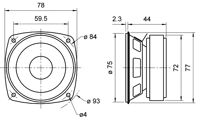 78mm Breitbandlautsprecher mit starkem Magnetantrieb und hohem Schalldruckpegel.