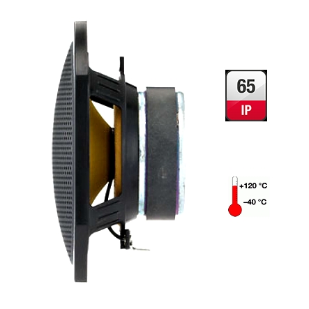 Kunststoffkorb und Kunststoffgitter (nicht abnehmbar!) Glasfasermembrane. Durch dauerhafte Wetterfestigkeit besonders geeignet für Außenbeschallung, Schwimmbäder, Sauna, Bad, Terrassen, Boote, Schiffe und offene Fahrzeuge.