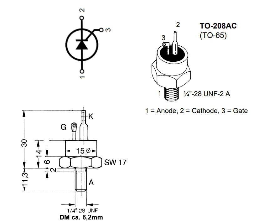 60A Schraubthyristor TO208 800V bis 60A Ideal für Reparatur von Ladegeräten z.B. von Bosch u.a. Ladeschaltungen, Gleichspannungsreglern, Licht- und Motorensteuerungen usw. Ersetzt viele Typen selbe Bauform z.B. auch 16RIA Serie .. uvwm.