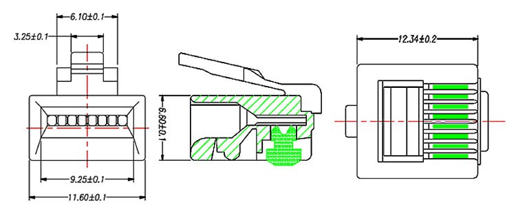 RJ45 Stecker Modularstecker bzw. auch Westernstecker genannt RJ45 Modular-, bzw. Westernstecker RJ45 ungeschirmt WesternStecker 8pol. Western-Stecker Acryl 8P/8C ungeschirmt. Type: Modularstecker / Westernstecker / RJ45 Stecker Abschirmung Nein Anschlusstechnik der Kontakte : Schneidklemmtechnik Art RJ45 Stecker gerade / Farbe klar Kontakte / Pole: 8polig Verwendung fürr Flachkabel Leiter AWG28-AWG26 Konfektionsartikel ja für Kabelkonfektion Betriebsstrom (Nom.) 1,5A Lebensdauer in Steckzyklen = ca. 750 Material (Anschluss) Phosphorbronze, vergoldet Material (Gehäuse) Polycarbonat Material (Steckbereich) Phosphorbronze, vergoldet Montage Kabelmontage Isolationswiderstand (Min.) 1000-Mohm Kontaktwiderstand (Max.) 20mOhm Brennbarkeitsklasse UL94V-2 Betriebstemperatur -40 °C ....+ 70 °C Verpackungsart Schüttware Abm.: Länge ca. bis 22,7mm B: 11,7mm H: 6,6mm Zusatzinformation : Mit passender Zange z.B. Art-Nr 97-905-00001 kann auf der Unterseite eine Kabelzugentlastung aktiviert werden Siehe z.B. auch weitere Bilder Optional passende Hauben siehe auch im Zubehör Register : Bst-Nr 39-875-00290 = Schwarz Bst-Nr 39-875-00300 = Rot Bst-Nr 39-875-00310 = Blau Bst-Nr 39-875-00320 = Grün Bst-Nr 39-875-00330 = Gelb Bst-Nr 39-875-00340 = Grau/Beige