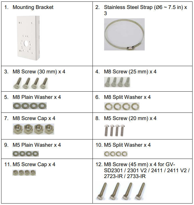 Masthalter zur Befestigung von Outdoor Produkten wie Kameras, Dome, Audiotechnik, Beleuchtungen usw. für Masten mit 80 - 150mm Durchmesser. Universal Masthalter für Wandarme, Kameradoms, Lautsprecher, Beleuchtungstechnik usw Masthalterung zur Befestigung von Kameras Leuchtmitteln Lautsprechern usw. Universell verwendbar Halterung für Masten, Pfosten, Regenrohre usw. Die Kamera oder auch Lautsprecher wird auf der ALU Druckguss Basisplatte befestigt; Anbringung an Masten bzw. Rohre mit Hilfe von 3 hoch widerstandsfähigen Befestigungschellen (Metallbänder) für einen Mast-Durchmesserbereich zwischen 80 und 150 mm. Universell verwendbar. Kann auf allen zylinderförmigen Oberflächen angebracht werden, deren Abmessungen in diesem Bereich liegen. TECHNISCHE DATEN Für Rohre im Durchmesserbereich 80... 150 mm Abmessungen H: 170mm B: 130mm ( H: 42mm ) Mitteloch auf Basisplatte = 35mm Durchmesser Umgebung Innen/Außen Material Aluminium Druckguss Platte 3,3mm Materialstärke 4 x integriertes Gewinde M8 8 x integriertes Gewinde M6 3x integriertes Gewinde M4 9x integriertes Gewinde M3 Farbe Weiß Belastbarkeit laut Herstellerangaben bis max 22Kg PACKUNGSINHALT 1x Halterung weiss ALU Druckguss 4x V2A M8 Schrauben für die Montage 2x Stahlbänder (B: 14mm) für Mast von 80mm bis 150mm Umfang 1x Inbusschlüssel