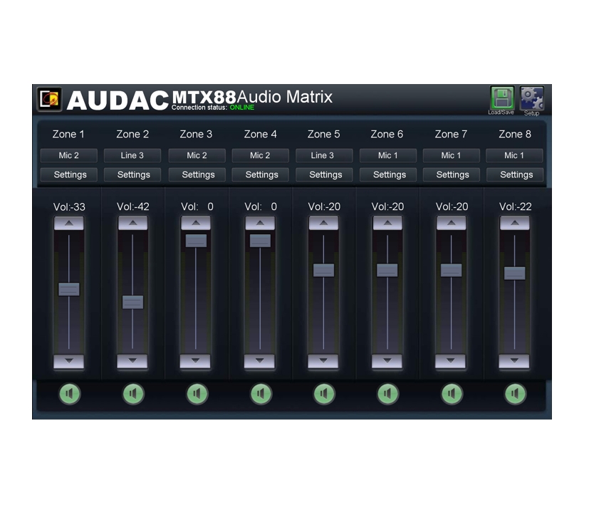 Dank der integrierten RS232-Schnittstelle ist der AUMTX mit allen auf dem RS232-Standard basierenden Automatisierungs-systemen für den Heim- oder Profibereich kompatibel. Die Steuerung und Konfiguration der einzelnen Zonen des MTX erfolgt über die frontseitig zugänglichen Drehregler mit Schaltfunktion und Status-LEDs. Über den eingebauten PFL-Lautsprecher lassen sich die einzelnen Zonen auch ohne zusätzlichen Kopfhörer vorhören. Die Anschlüsse der symmetrischen Line-Ausgänge sind als dreipolige Klemmleisten ausgeführt. Außerdem steht für jede Zone eine RJ45-Buchse zum Anschluss wandmontierter Anschlussfelder zur Verfügung. Über den 24 Volt Stromanschluss lässt sich der MTX auch während eines Stromausfalls über eine Notstromversorgung betreiben.