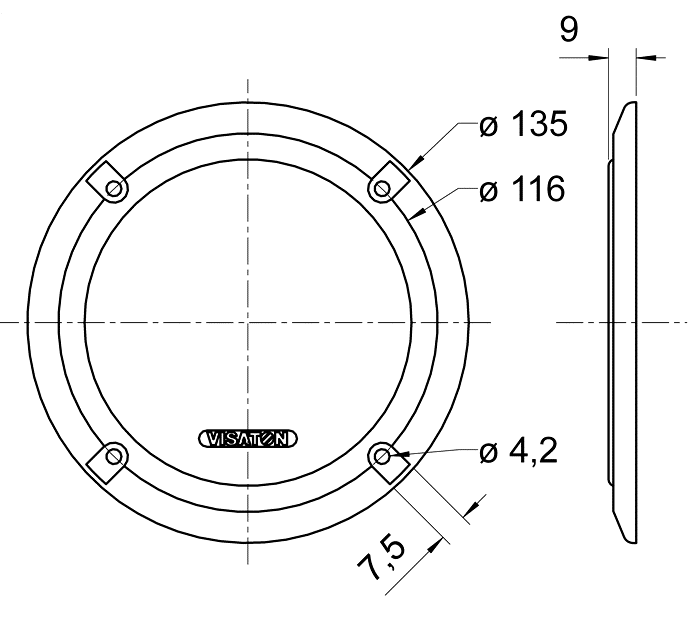 Lautsprechergitter Lautsprecherblende, Lautsprecherabdeckung bzw. Schutzgitter aus matt-schwarz lackiertem Metall. Zierring aus schwarzem ABS-Kunststoff. Die 4 Befestigungsbohrung sind vom Gitter überdeckt. passend für: FR10 / R 10 S / R 10 S / R 10 SC / FX 10 und viele mehr Für 100...116mm DIN Lautsprecher Abmessungen Aussendurchmesser: 134mm Innendurchmesser: 116mm Bauhöhe: 14mm 4x 4,8mm Befestigungsbohrungen