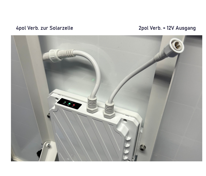 + 2x Steckverbinder Rückseitig am Akkupack ( 1x Verbindung zur Solarzelle ( 4pol ) und 1x 12V Ausgang ( 2pol )