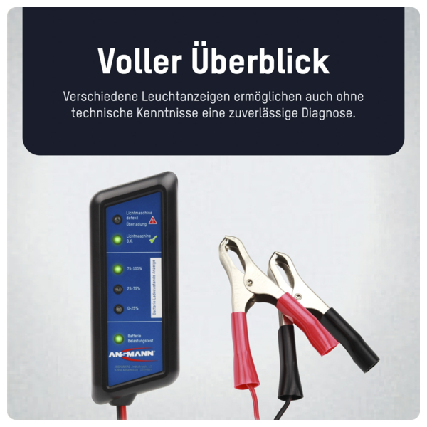 Professionelles Kfz-Testgerät zum Prüfen von 12V Kfz-Batterien und des Ladestromkreises der Lichtmaschine handliches, kompaktes Design im Taschenformat genaue Überprüfung des Ladezustands sowie die Startbereitschaft der Kfz-Batterie einfache Handhabung, welche eine dauerhafte Überwachung der Autobatterie ermöglicht erkennt sofort defekte Kfz-Batterien, zusätzlich kann ein Belastungstest der Kfz-Batterie durchgeführt werden bei Bedarf ist das Gerät ebenfalls zur Überwachung des Ladevorgangs bei Geräten ohne Überladeschutz einsetzbar das Gerät ist mit einem Kurzschluss- und Verpolschutz ausgestattet